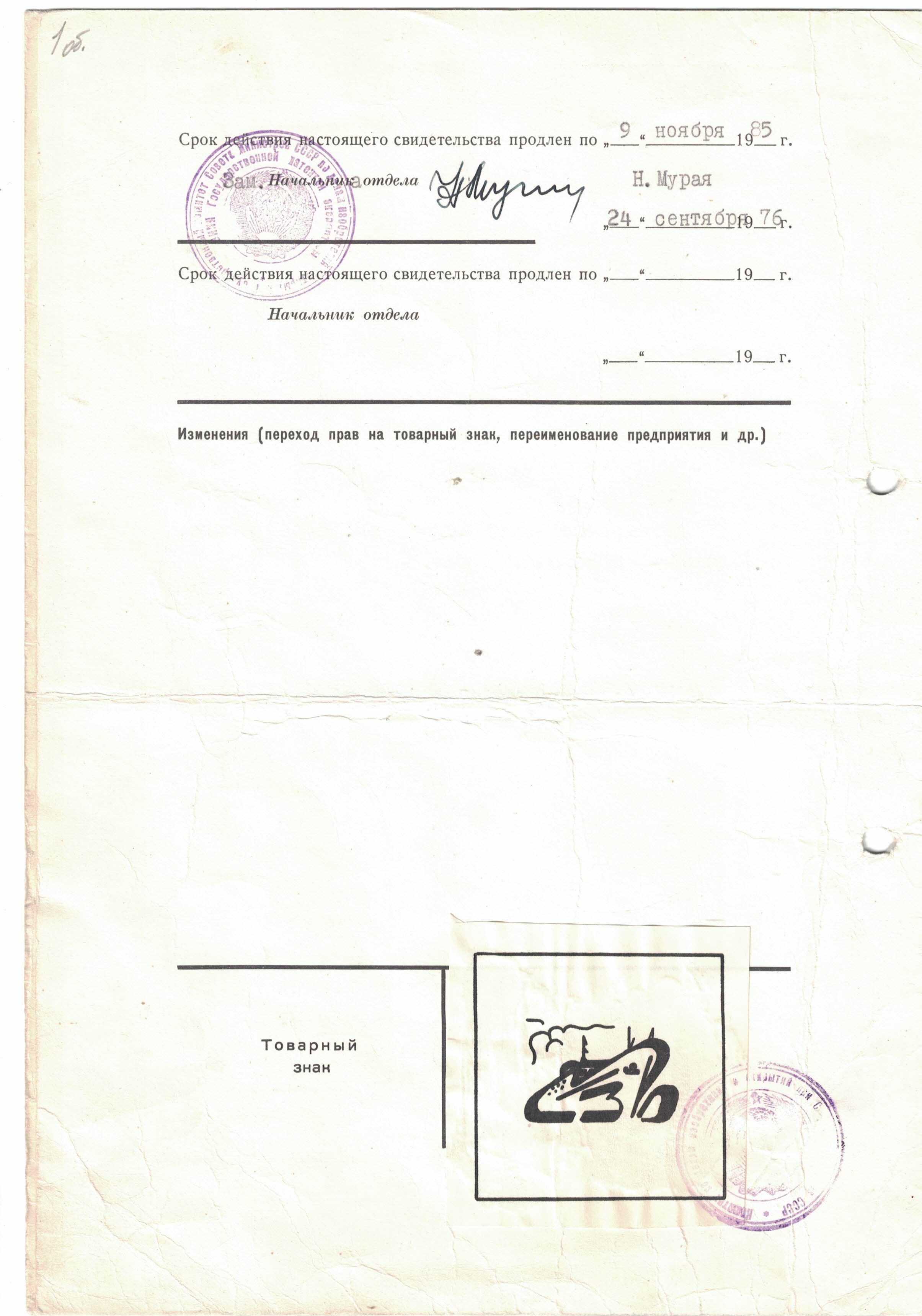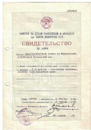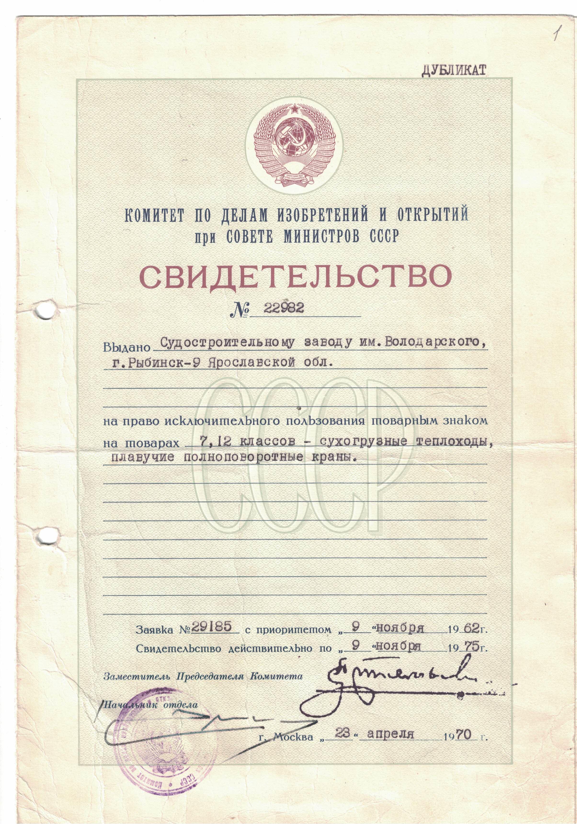 Завод получил право исключительного пользования товарным знаком на товарах 7, 12 классов – сухогрузные теплоходы, плавучие полноповоротные краны.[23](Рис.4).