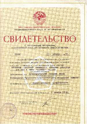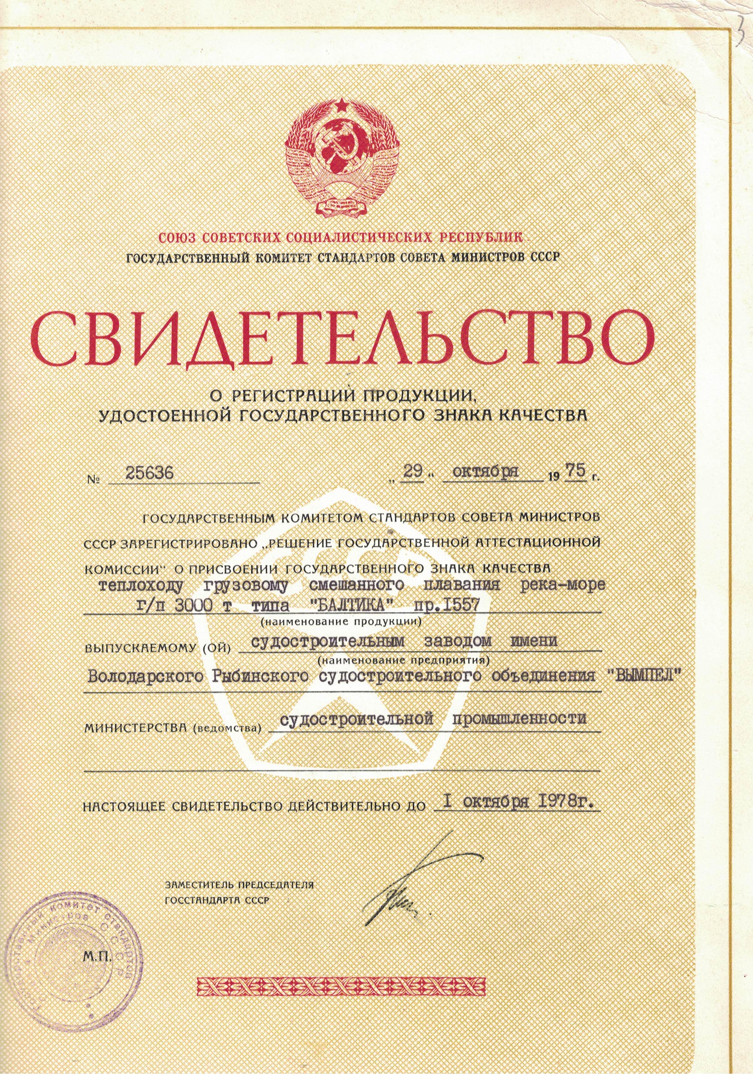 Выпускаемому судостроительным заводом им. Володарского грузовому теплоходу смешанного плавания «река-море» г/п 3000 т типа «Балтика» с октября 1975 года был присвоен Государственный знак качества.[25](Рис.5).