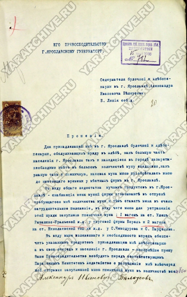 Прошение содержателя булочной и хлебопекарни А. И. Белоусова Ярославскому губернатору о разрешении внеочередной отправки закупленной в г. Саратове партии пшеничной муки. 15 февраля 1916 г. ГКУ ЯО ГАЯО. Ф. 137. Оп. 1. Д. 5126. Л. 20.