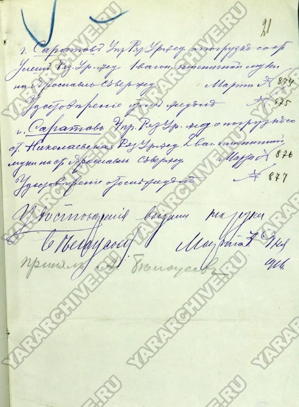 8 А. Справка, выданная А. И. Белоусову, подтверждающая закупку и погрузку партии пшеничной муки в г. Саратове для отправки на станцию Ярославль Северной железной дороги. 3 марта 1916 г. ГКУ ЯО ГАЯО. Ф. 137. Оп. 1. Д. 5126. Л. 21.
