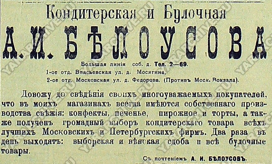 В «Ярославском календаре» 1912 г. опубликована реклама следующего содержания: «Кондитерская и булочная А. И. Белоусова.