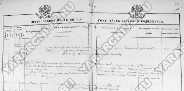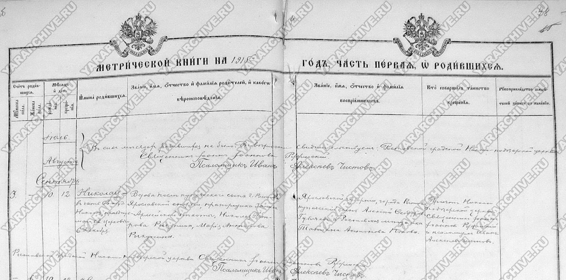 Запись о рождении Николая Николаевича Рыкунина из метрической книги Николоподозерской церкви г. Ростова, 1915 год