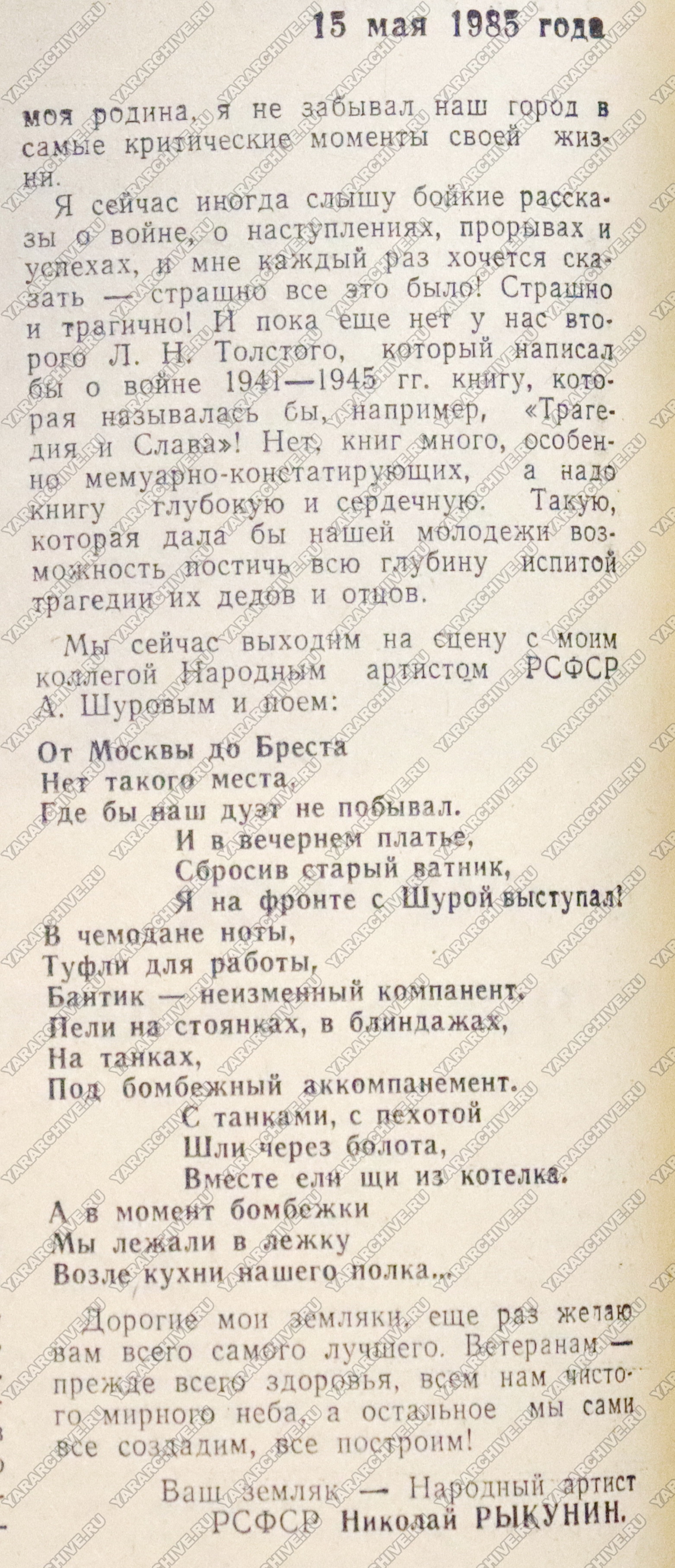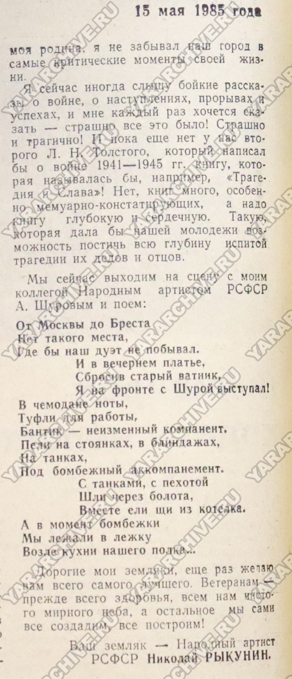Из статьи «Моим землякам», «Путь к коммунизму», № 78 от 17.05.198539