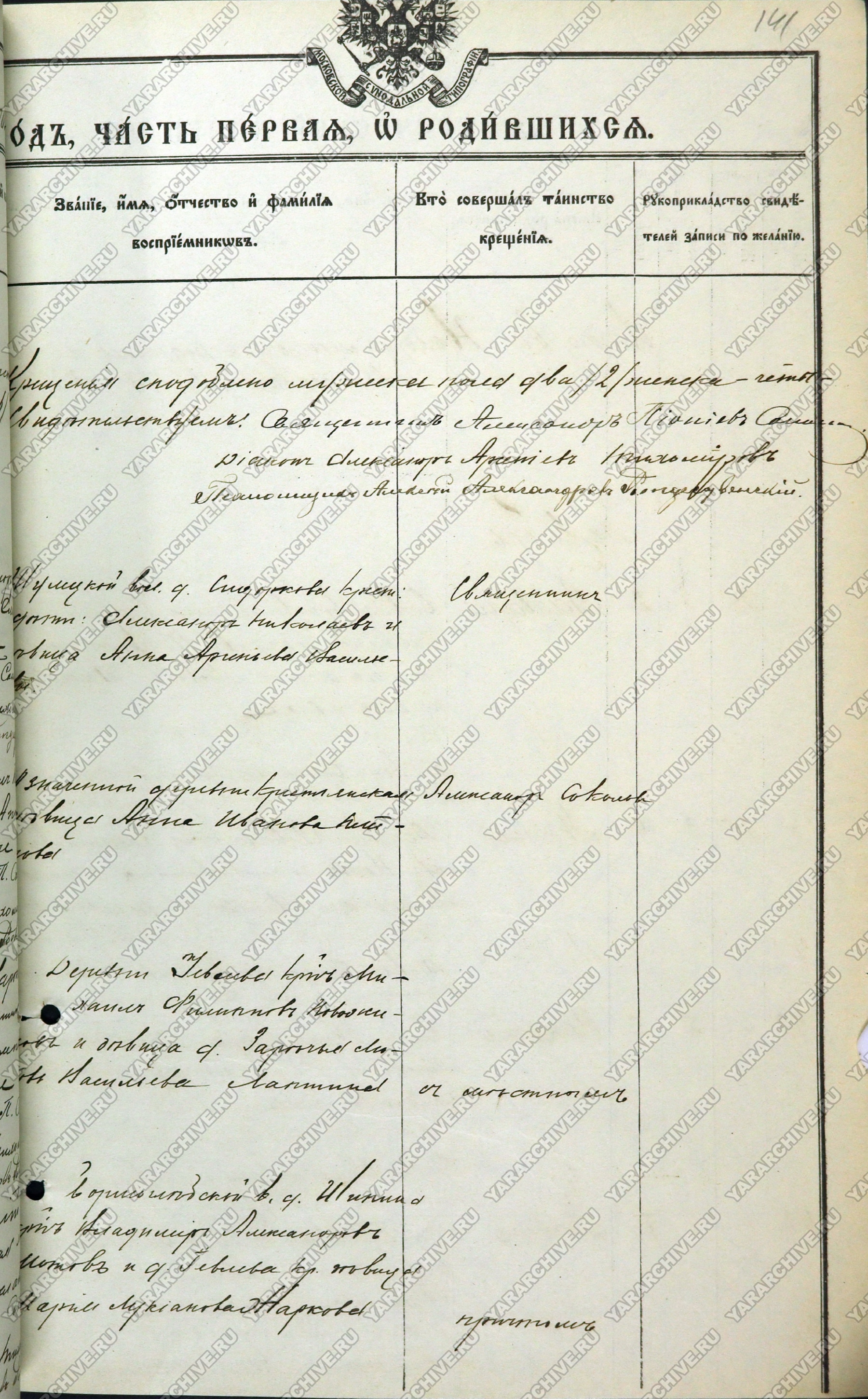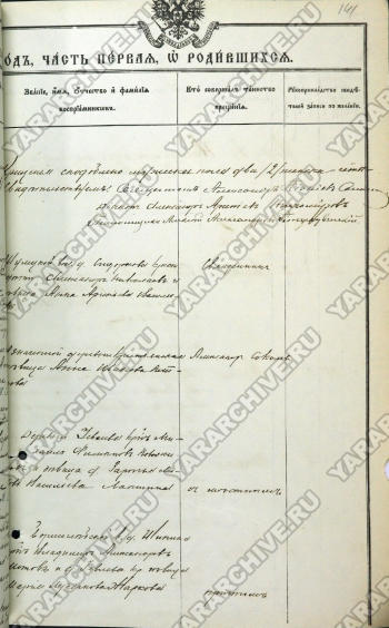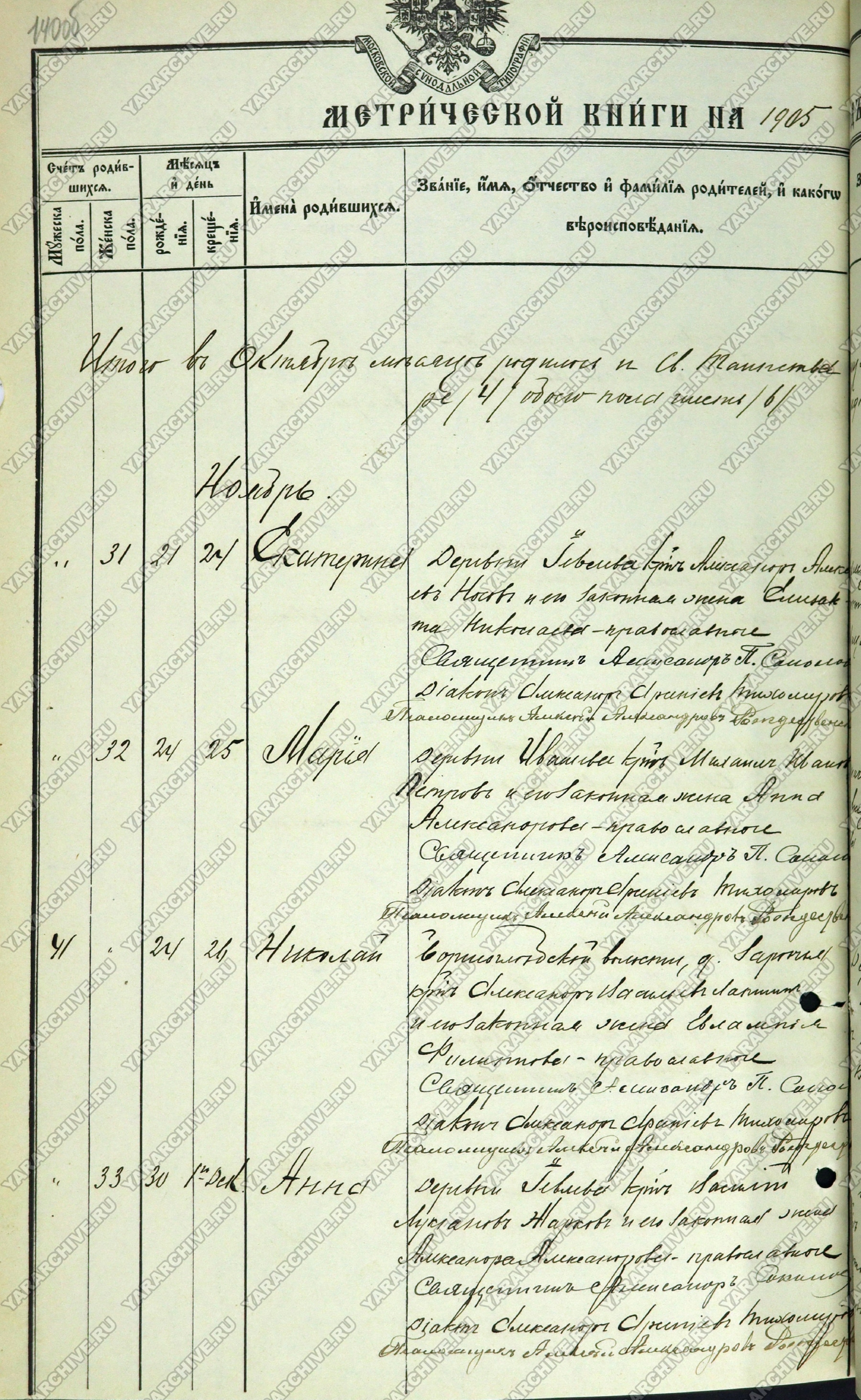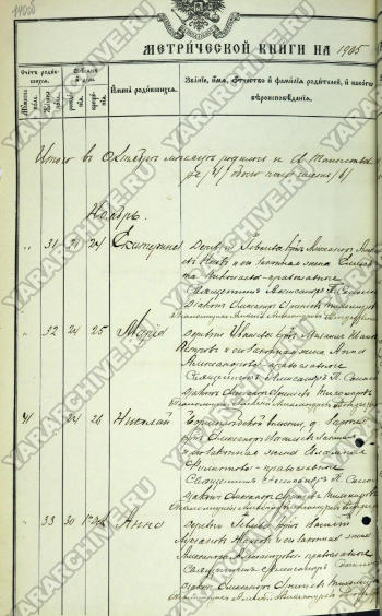 Запись о рождении и крещении Н. А. Лапшина из метрической книги церкви села Шулец Ростовского уезда Ярославской губернии. 1905 г. ГКУ ЯО ГАЯО. Ф. 230. Оп. 15. Д. 158. Л. 140 об, 141.