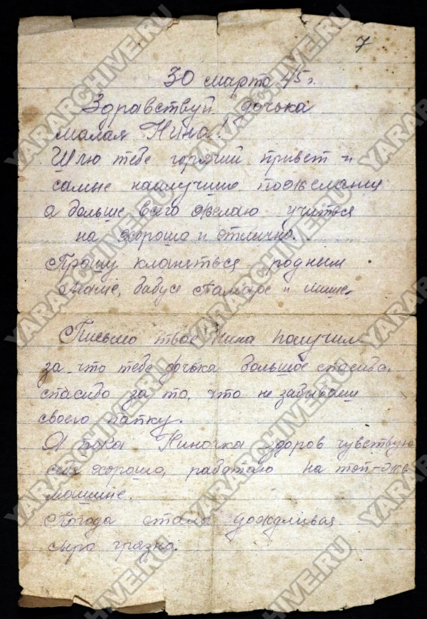 Из письма Н. А. Калинина дочери Нине. 30 марта 1945 г. ГКУ ЯО ГАЯО. Ф. Р-849. Оп. 1. Д. 126. Л. 7.