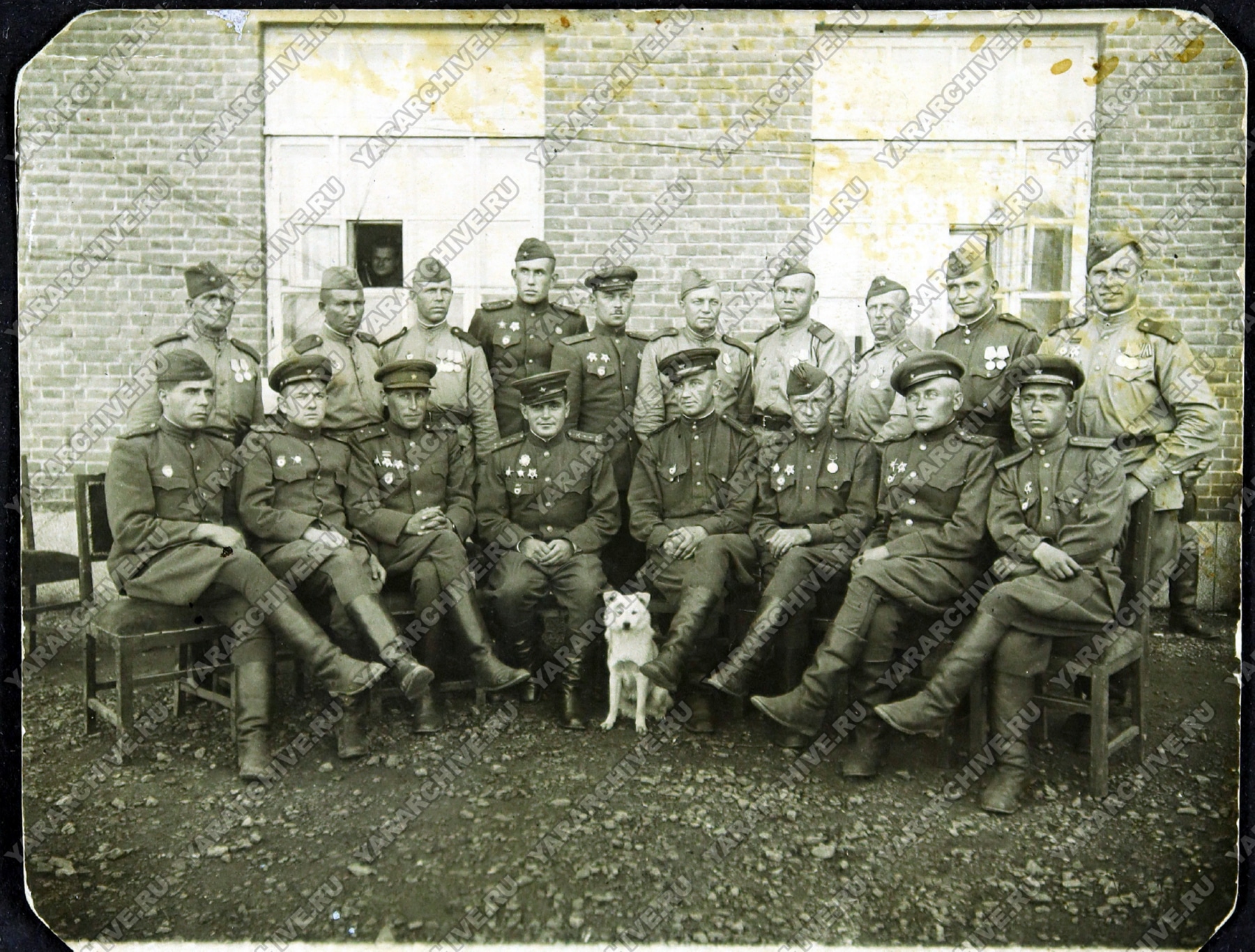 Фотография Н. А. Калинина (крайний справа во втором ряду) в группе с сослуживцами. 29 сентября 1945 г. ГКУ ЯО ГАЯО. Ф. Р-849. Оп. 1. Д. 129. Л. 3.
