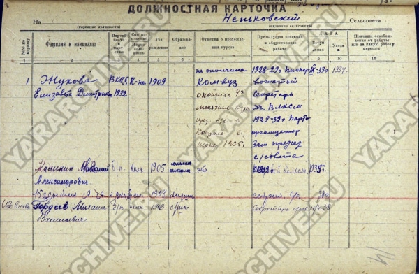 Сведения о Н. А. Калинине из «Должностной карточки по Неньковскому сельсовету Борисоглебского района Ярославской области». Б. д. ГКУ ЯО ГАЯО. Ф. Р-2380. Оп. 13. Д. 4. Л. 14.