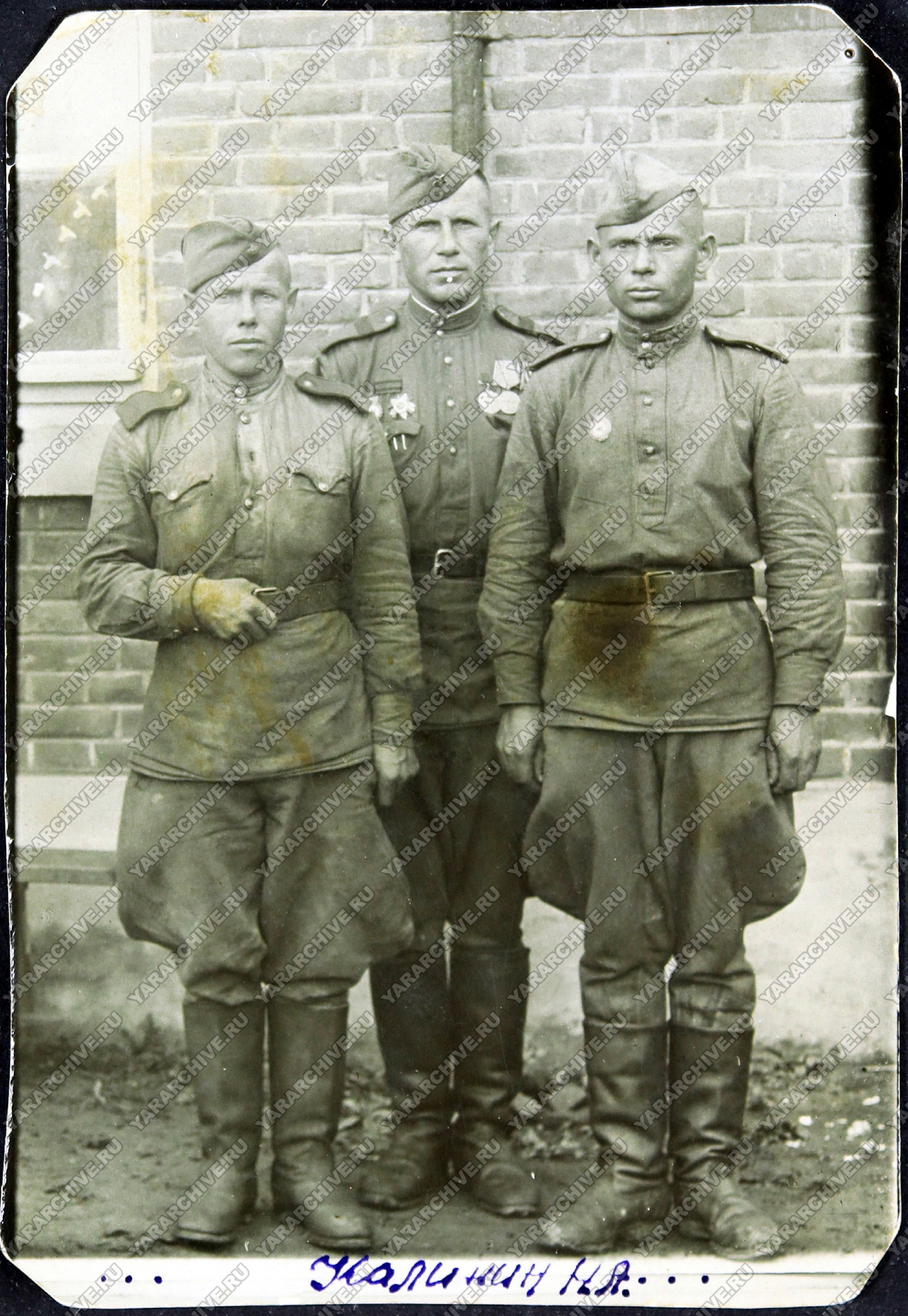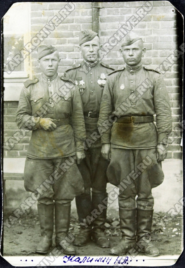 На фотографии Н. А. Калинина с сослуживцами, датированной 29 сентября 1945 г., сохранилась дарственная надпись гвардии-майора Сорокина: «т. Калинину! В память об офицерах, с которыми прошел войну на западе и на востоке...»18