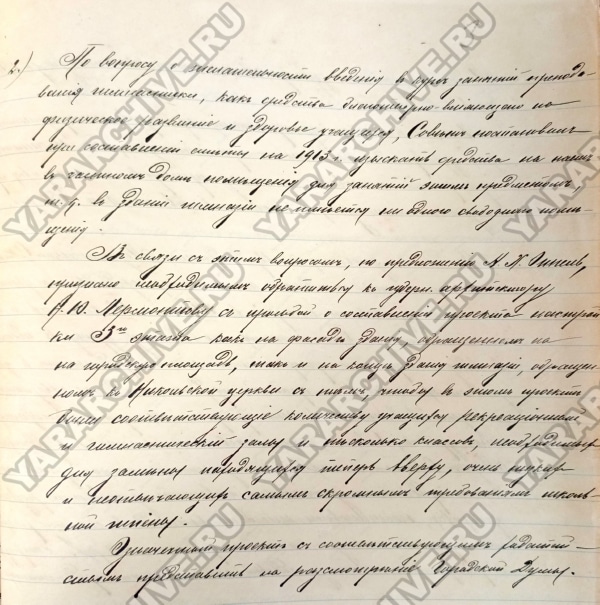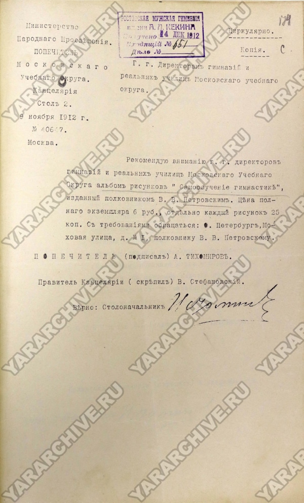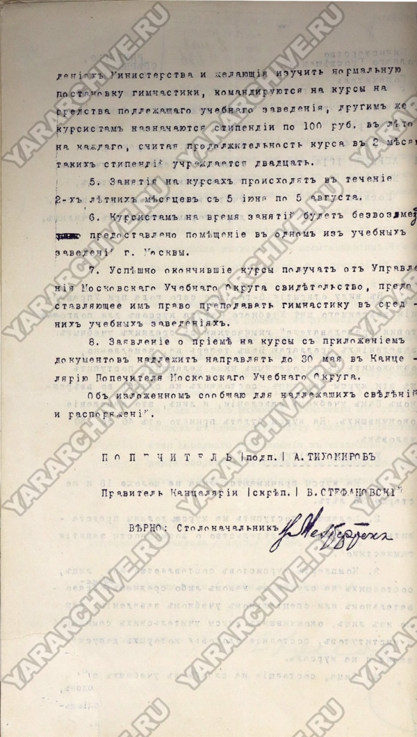 Однако к 1909 г. в Министерство народного просвещения Московского учебного округа стали поступать жалобы на то, что учителя гимнастики некоторых учебных заведений «склонны переходить к упражнениям тяжелой атлетики», «признанных медицинскою наукою вредными для неокрепшего организма учащихся». В связи с этим начальникам мужских и женских гимназий, директорам народных училищ рекомендовано было организовать врачебный контроль за преподаванием гимнастики, чтобы упражнения соответствовали силам и состоянию здоровья учащихся. Кроме того, обращалось внимание на важность «Инструкции для преподавания гимнастики в мужских учебных заведениях ведомства Министерства Народного Просвещения», которая была утверждена еще 26 апреля 1889 г.11