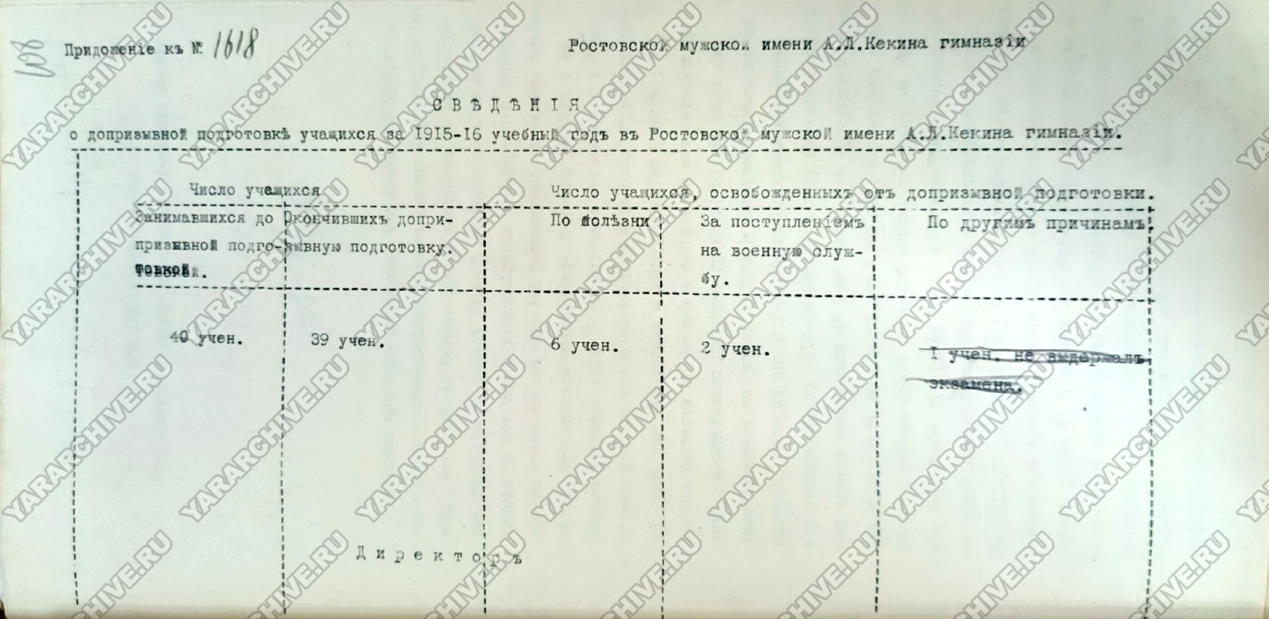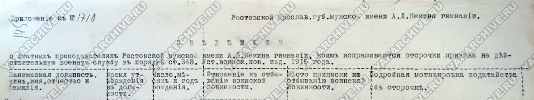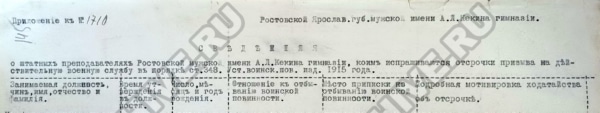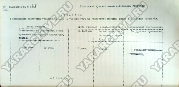 В гимназиях допризывная подготовка проводилась среди выпускников старших восьмых классов. В Ростовской мужской гимназии в 1915/1916 учебном году обучение прошли 39 учащихся.67
