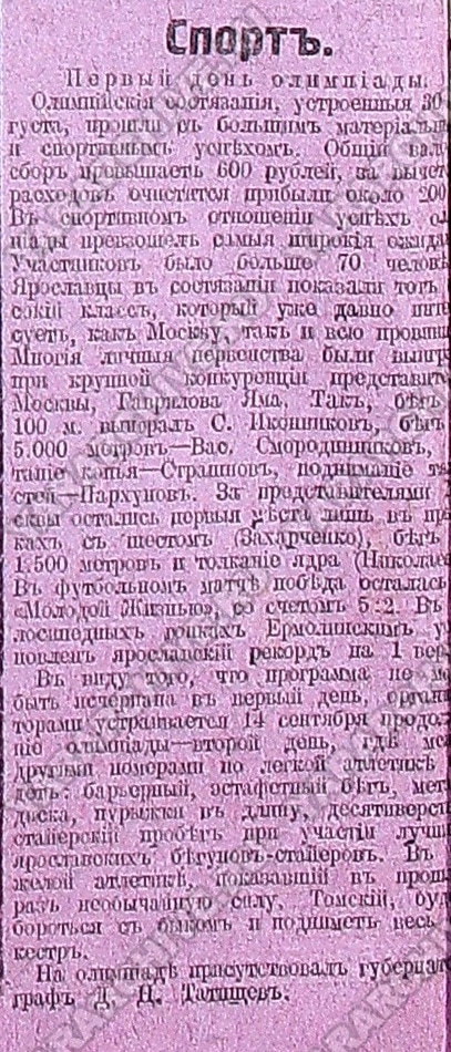 К сожалению, ростовцы в этой олимпиаде участие не принимали: «На олимпийских состязаниях... будут выступать представители Ярославля, Рыбинска, Кинешмы, Гаврилов-Яма, Риги, Москвы...».57