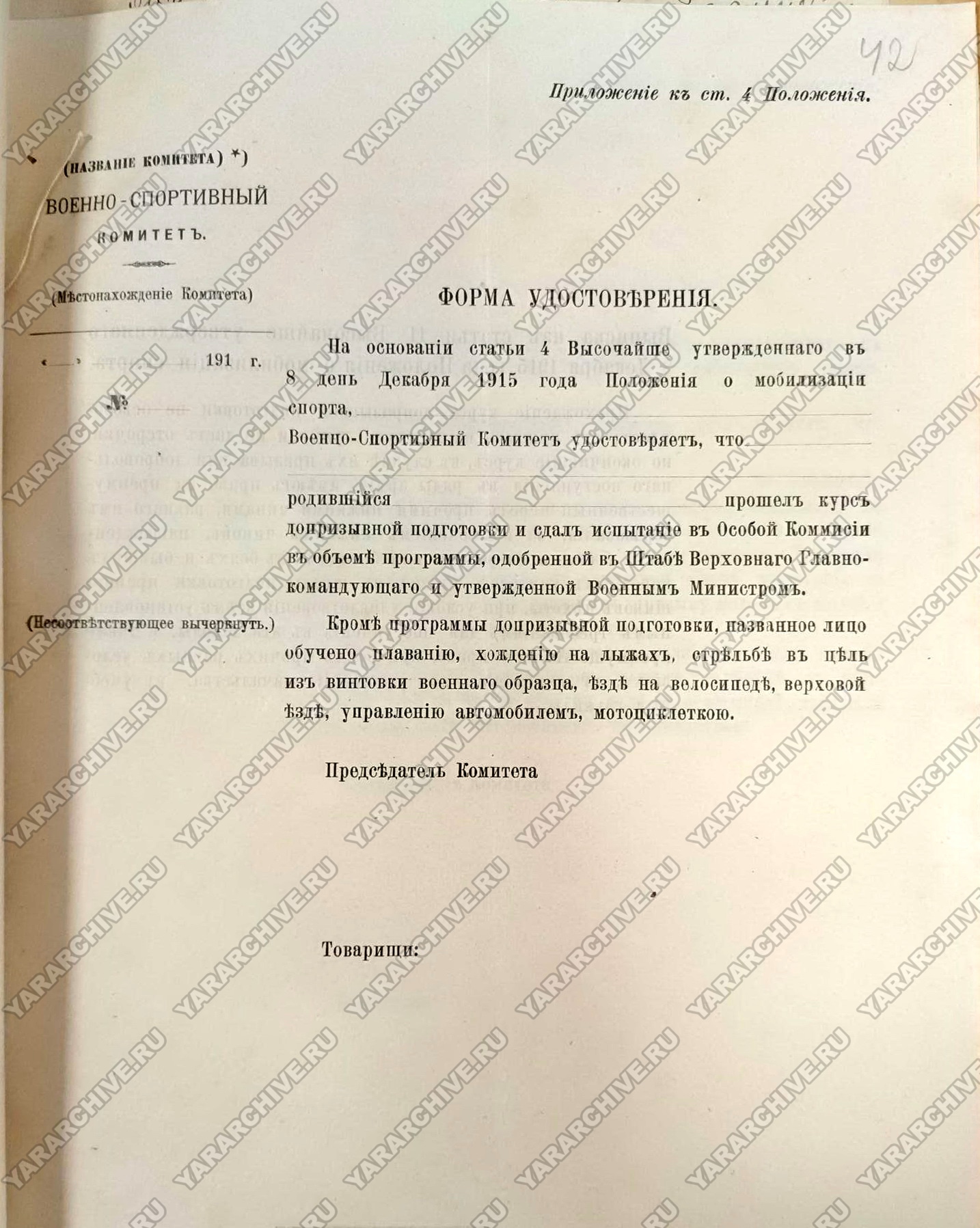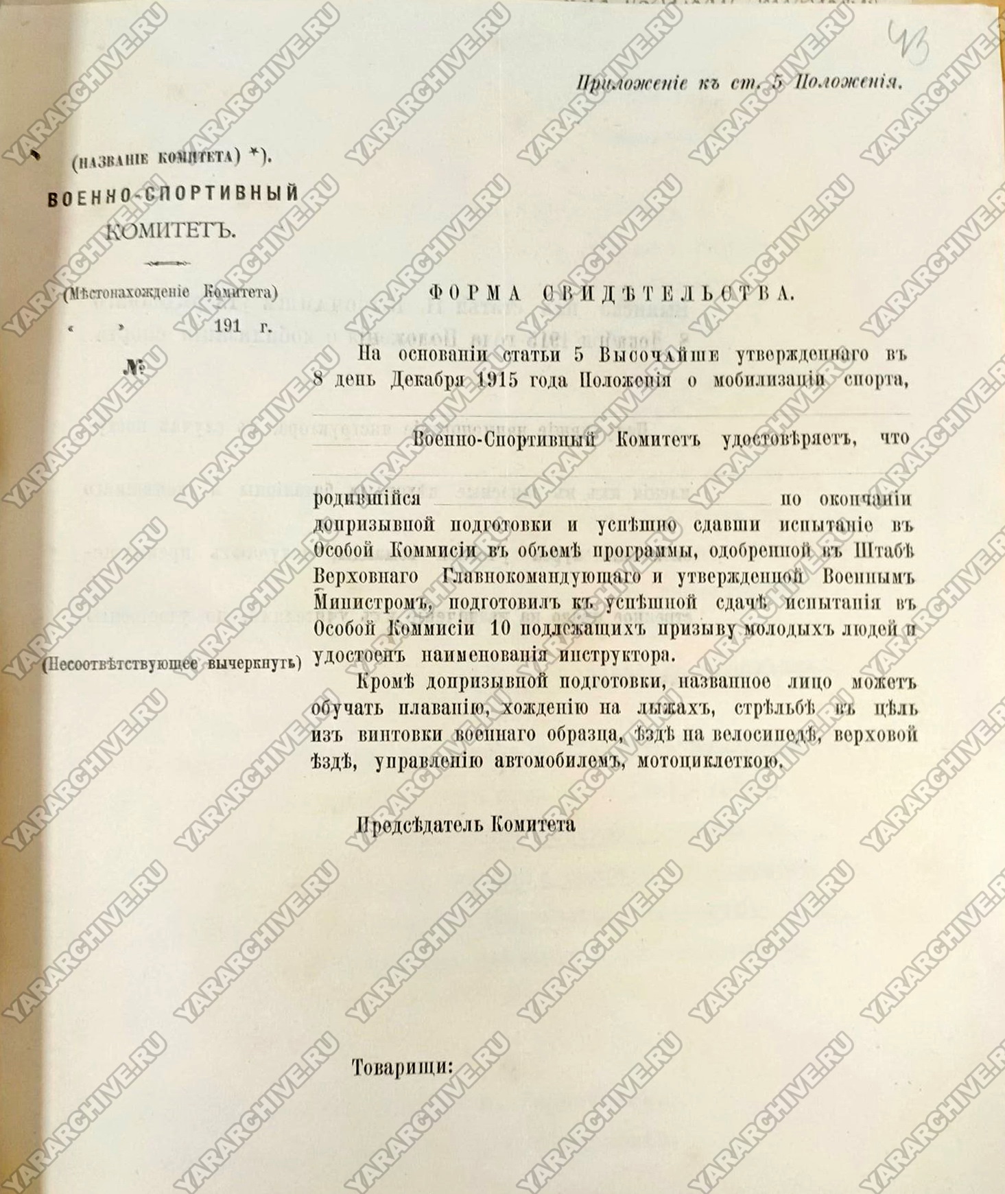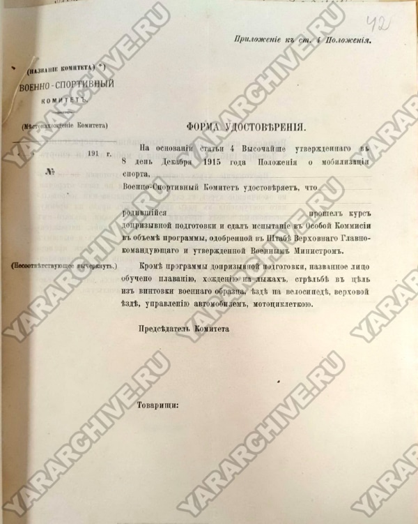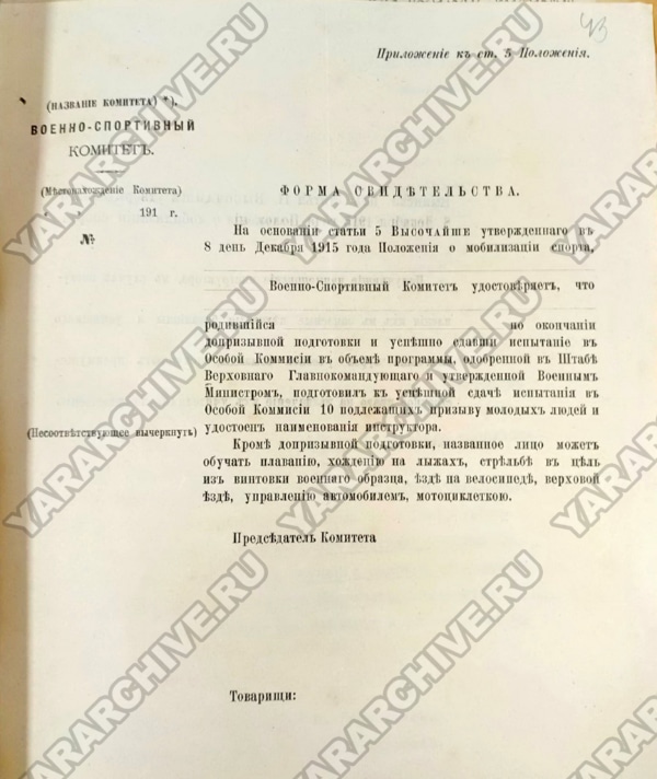 08 декабря 1915 г. Николай II утвердил «Положение о мобилизации спорта» с целью организации на время войны допризывной подготовки лиц, «подлежащих приему в войска».58 Для осуществления процесса обучения создавались военно-спортивные комитеты. В городах, где имелись спортивные, гимнастические общества или средние, высшие учебные заведения, образовывали по одному военно-спортивному комитету. В случае невозможности образовать такой комитет на месте, отдельные общества, организации или учебные заведения приписывались к ближайшему комитету. Руководство всеми комитетами было возложено на главнонаблюдающего за физическим развитием народонаселения Российской Империи генерал-майора В. Воейкова.59