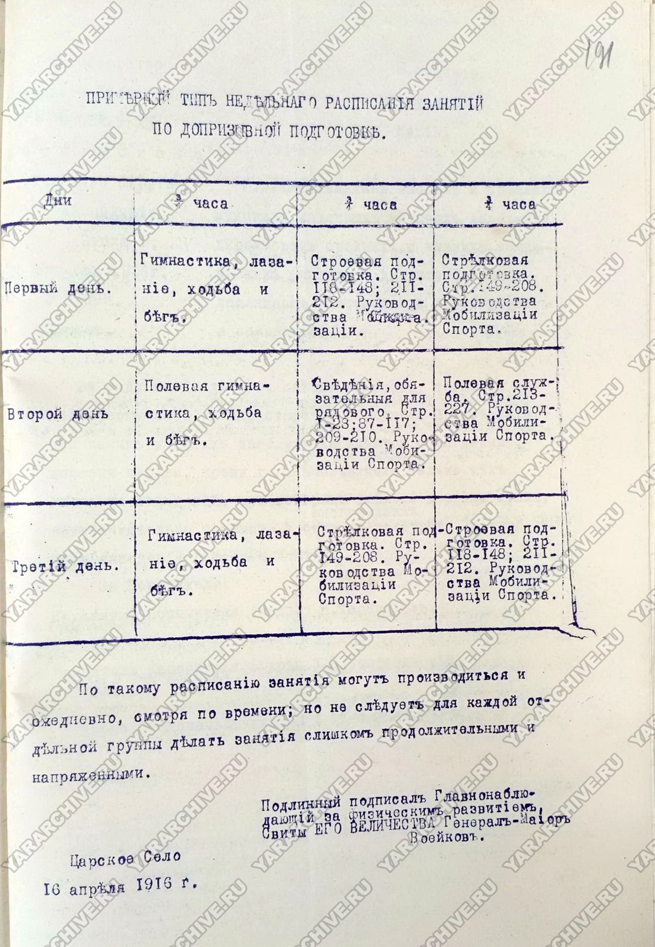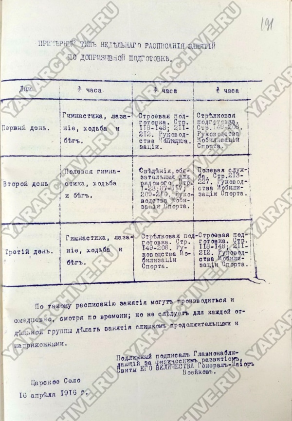 В апреле 1916 г. для выработки единой системы организации обучения были разработаны «Инструкция главнонаблюдающего за физическим развитием народонаселения Российской Империи» и примерный недельный план занятий по допризывной подготовке. Также обращалось внимание, что главной задачей при планировании является «выработка здоровых, сильных телом и духом, смелых, ловких и выносливых людей, знающих сверх того, те основы военного дела, которыя точно указаны в учебниках...», основное внимание уделялось практическим занятиям.63