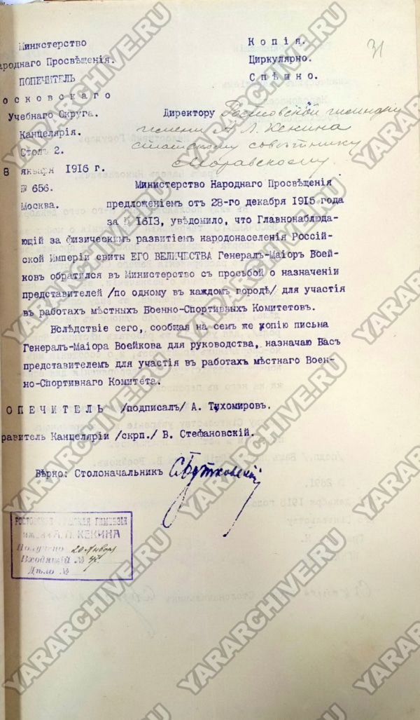 Для участия в работе местного военно-спортивного комитета был назначен статский советник, директор Ростовской мужской гимназии имени А. Л. Кекина Сергей Павлович Моравский.65