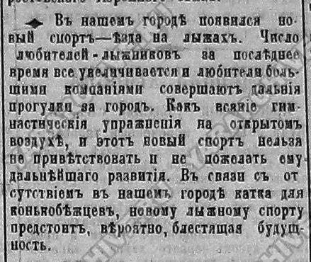 В 1900 г. в г. Ярославле появился новый вид спорта — лыжный. Это событие даже было отмечено в местной газете «Северный край»: «В нашем городе появился новый спорт — езда на лыжах. Число любителей-лыжников за последнее время все увеличивается... Как всякие гимнастические упражнения на открытом воздухе, и этот новый спорт нельзя не приветствовать и не пожелать ему дальнейшего развития. В связи отсутствием в нашем городе катка для конькобежцев, новому лыжному спорту предстоит, вероятно, блестящая будущность».5