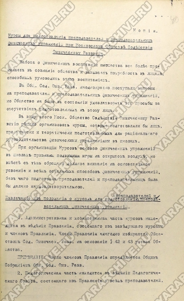 Конечно, чтобы грамотно организовать процесс преподавания, необходимы были подготовленные специалисты. Из сообщения председателя Московского общества содействия физическому развитию от 07 мая 1908 г.: «В современной русской школе на физическое развитие юношества не обращается должного внимания... Уроки гимнастики хотя и включены в программу занятий средне-учебных заведений, но до сих пор не принято мер для подготовления преподавателей гимнастики, со стороны начальства учебных заведений выставляются разные причины для исключения гимнастики из школьных занятий... Признавая, что уроки гимнастики займут в наших школах подобающее им место... лишь под условием, что руководителями будут всесторонне подготовленные преподаватели, Московское Общество Содействия Физическому Развитию организовало годичный курс для подготовления учителей и учительниц гимнастики...». Курс проводился с октября 1907 г. по май 1908 г.9