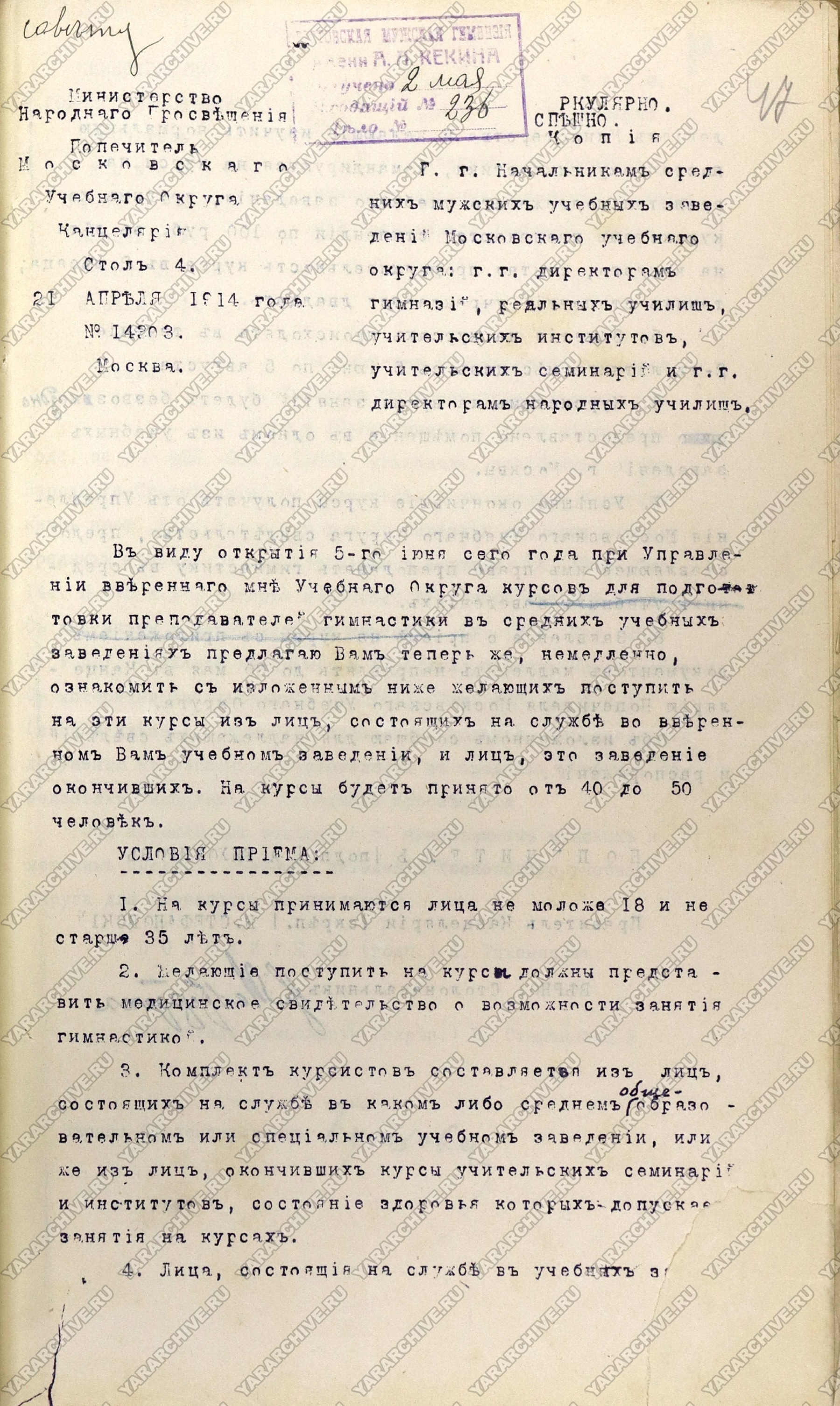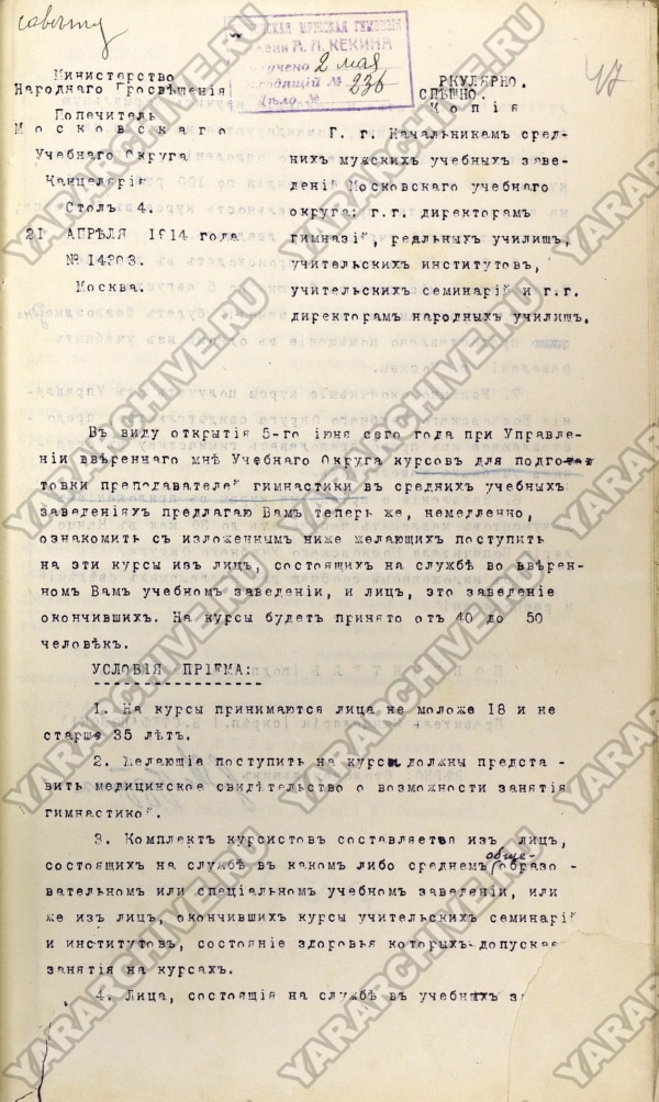 Летом 1912 г. в Санкт-Петербурге для учителей средних учебных заведений были организованы двухмесячные курсы гимнастики по ознакомлению «с делом постановки и ведения физического развития учащихся». Плата за курс составляла 30 рублей.14 В 1914 г. подобные курсы проходили в Москве.