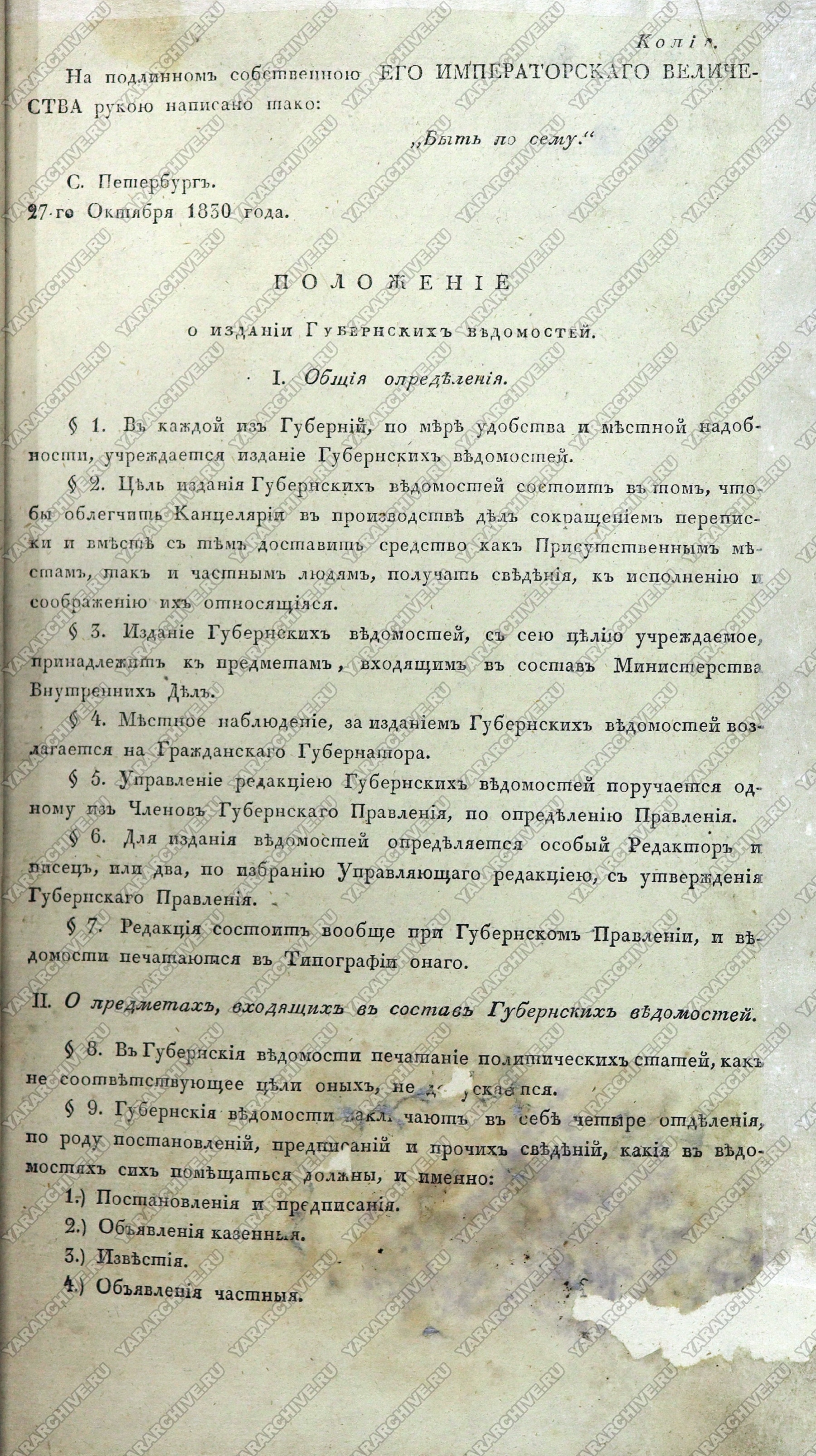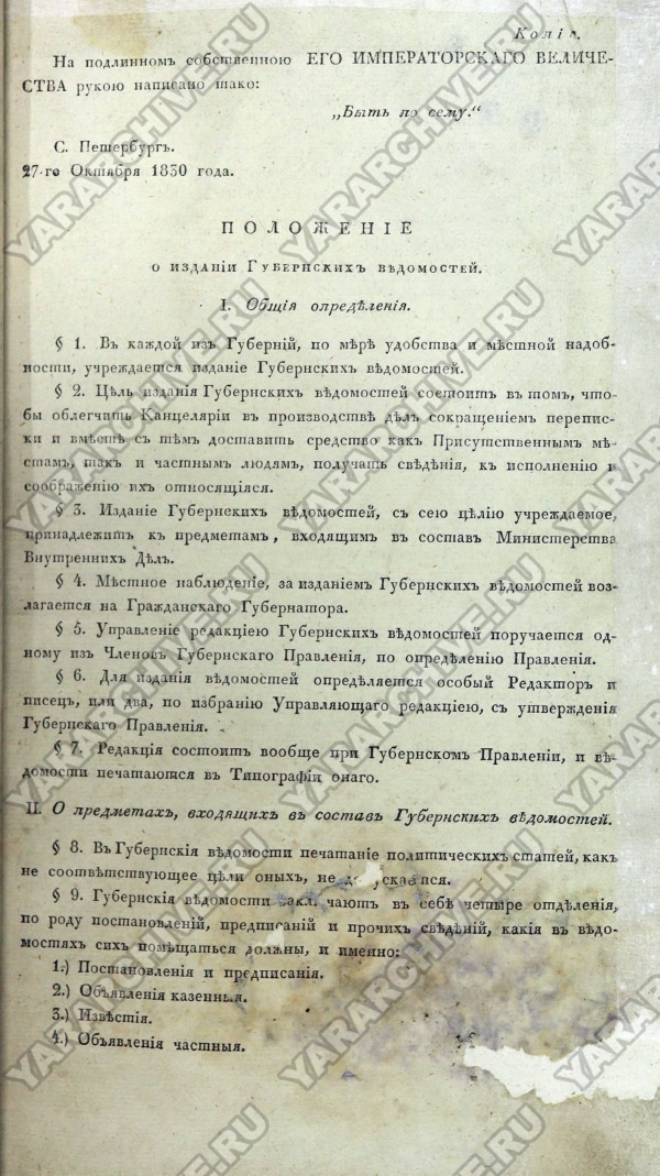 27 октября 1830 г. императором было одобрено «Положение о издании Губернских ведомостей».