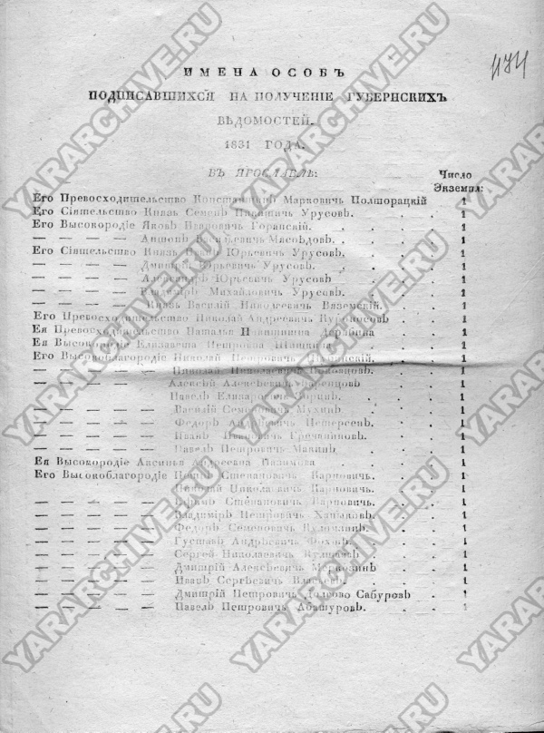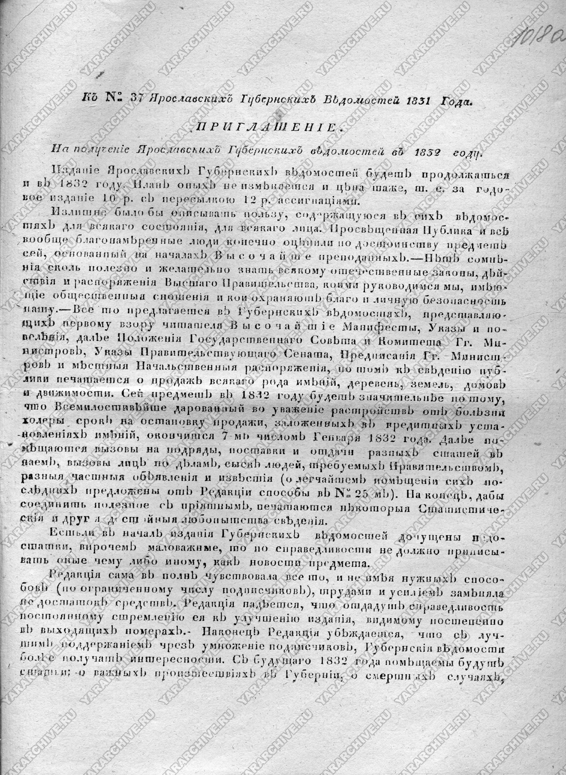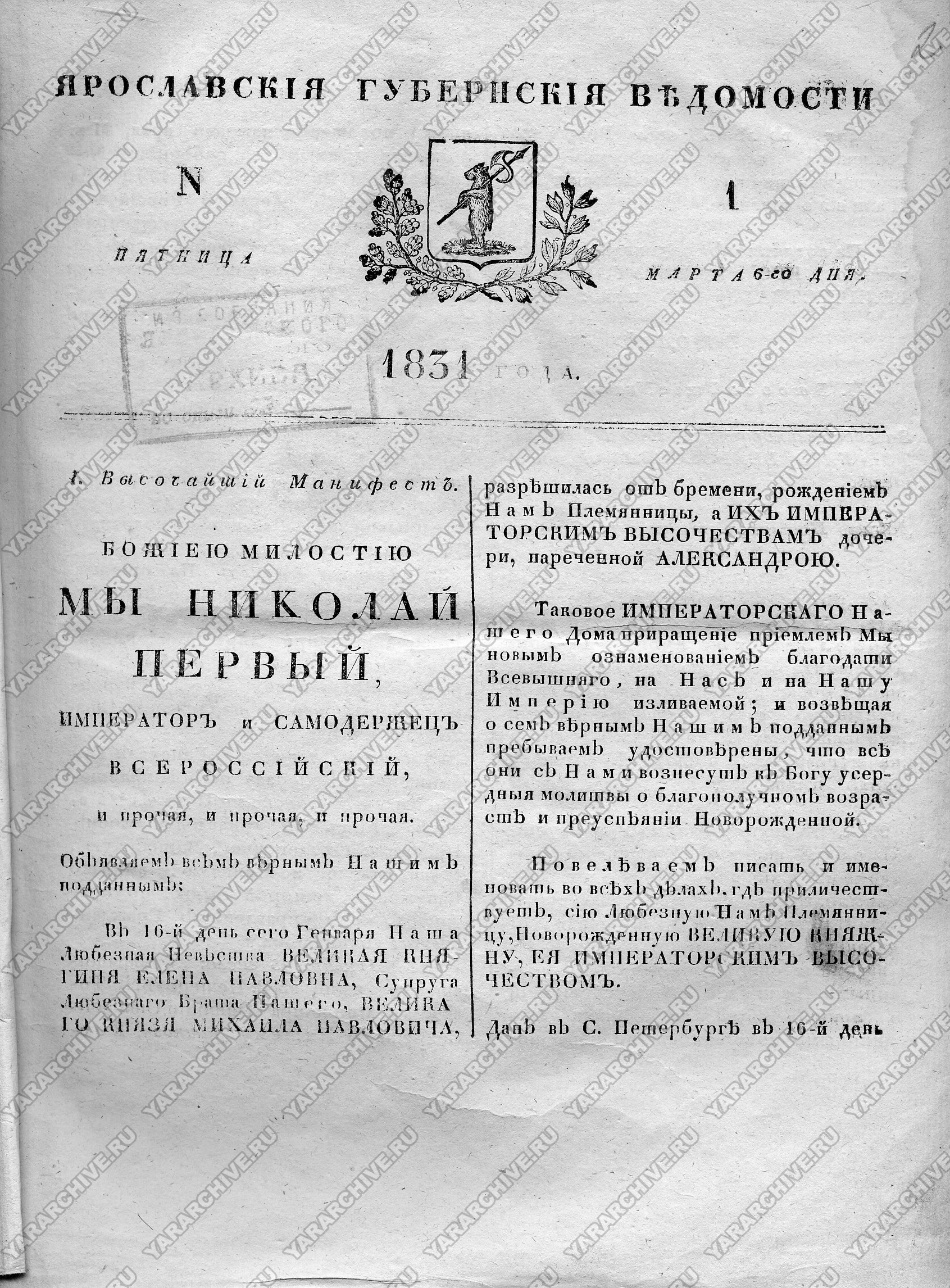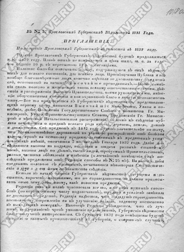 30 января 1831 г. датировано прошение советника, управляющего редакцией губернских ведомостей в Ярославское губернское правление «О снабжении редакции книгою для записи прихода и расхода денег», «По случаю открытия подписки на получение Губернских ведомостей...» 9