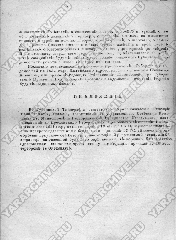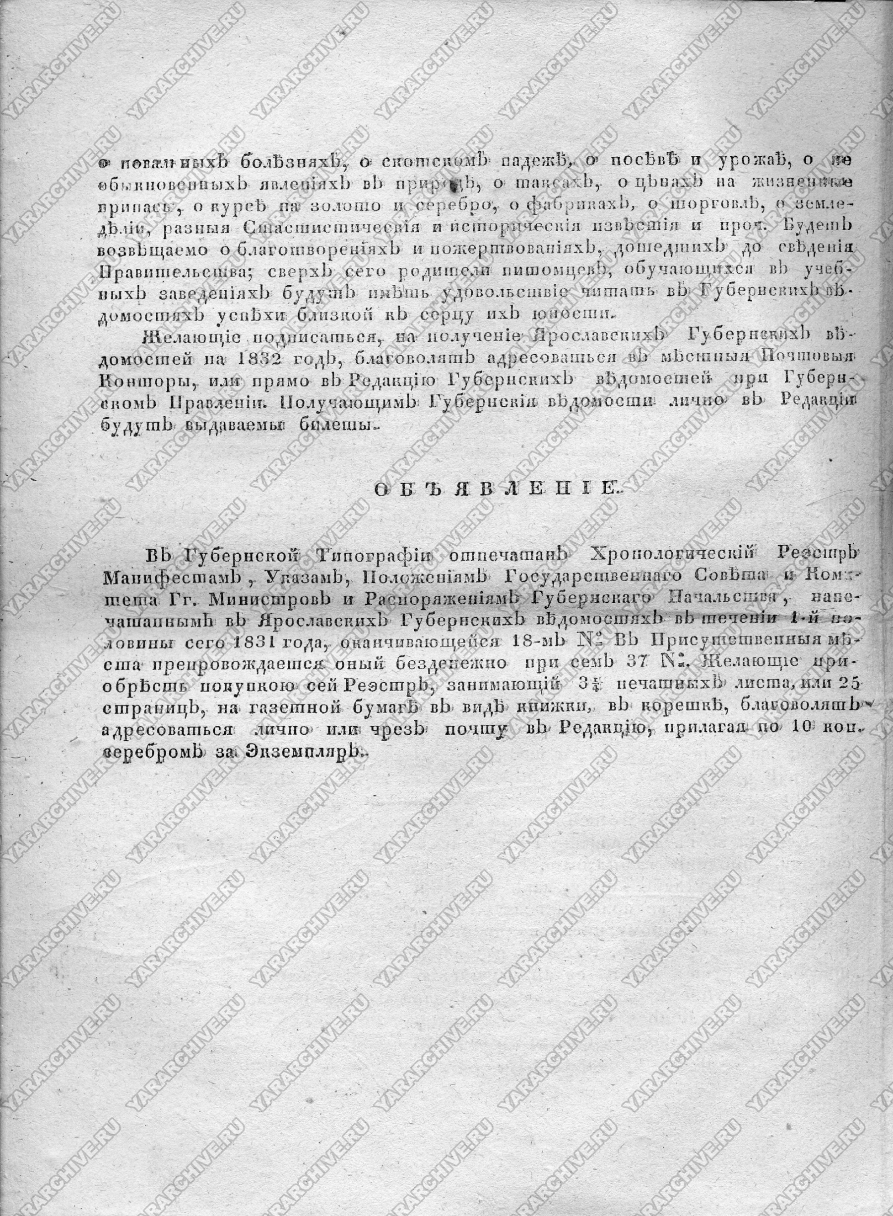 Объявление о подписке на 1832 г., опубликованное в № 37 газеты «Ярославские губернские ведомости» от 13 ноября 1831 г.