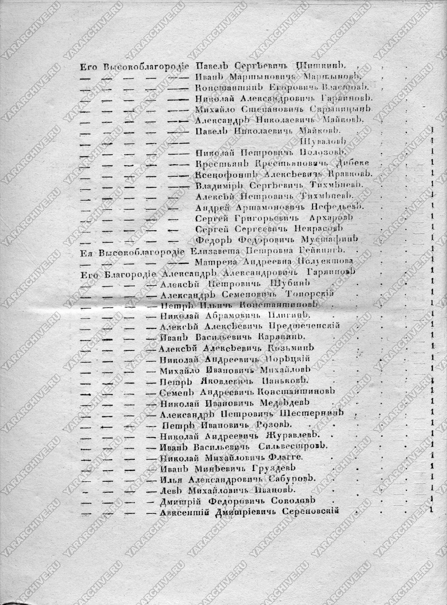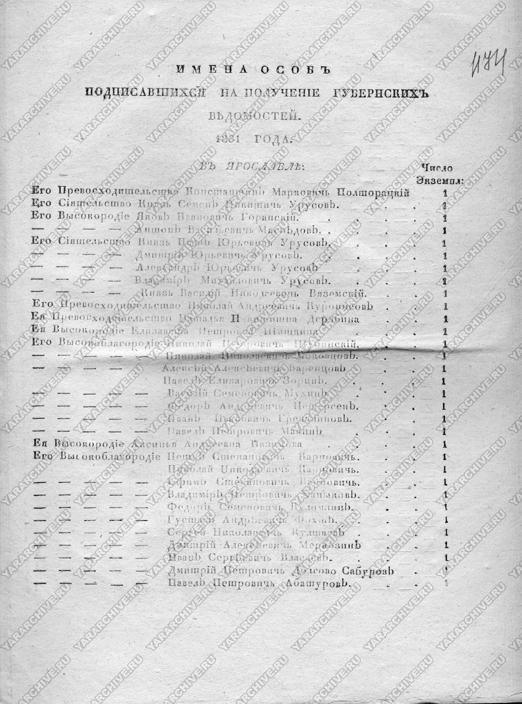 Список «Имена особ, подписавшихся на получение губернских ведомостей 1831 г.», помещенный в № 43 от 25 декабря 1831 г. Фрагмент.
