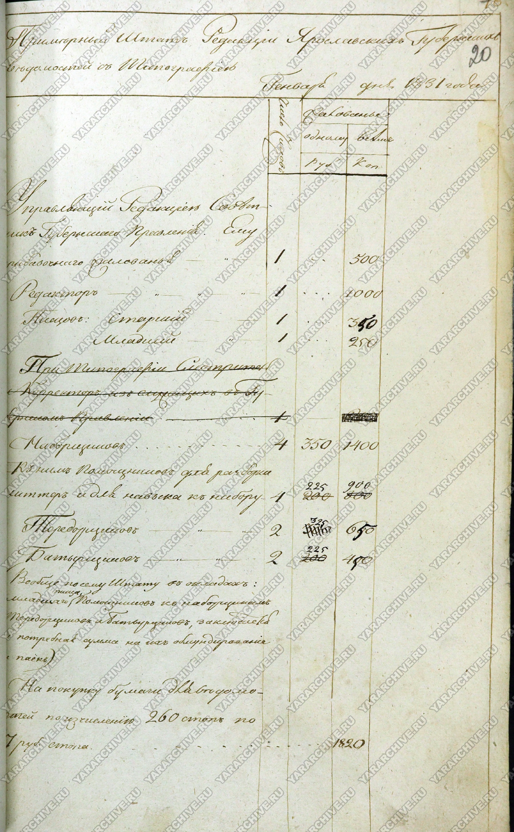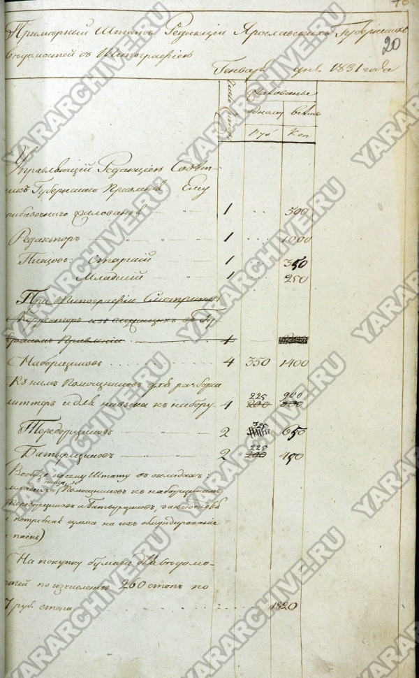 «Примерный штат редакции „Ярославских губернских ведомостей“ с типографиею». Январь 1831 г. ГКУ ЯО ГАЯО. Ф. 79. Оп. 5. Д. 167. Л. 20, 20 об.