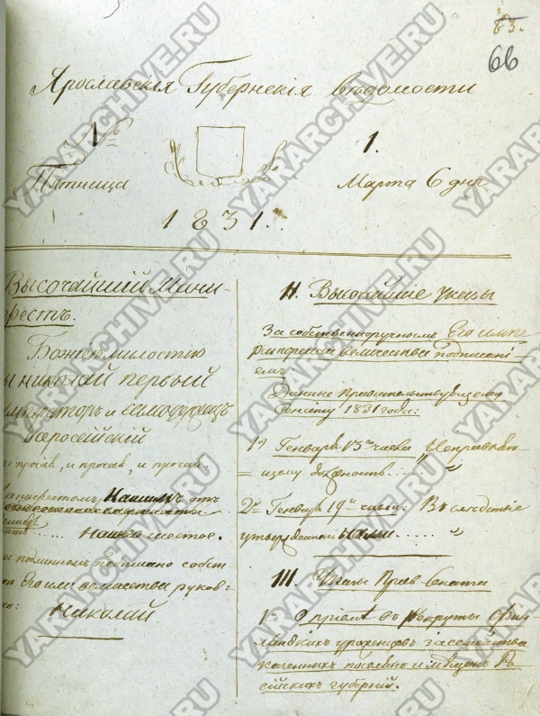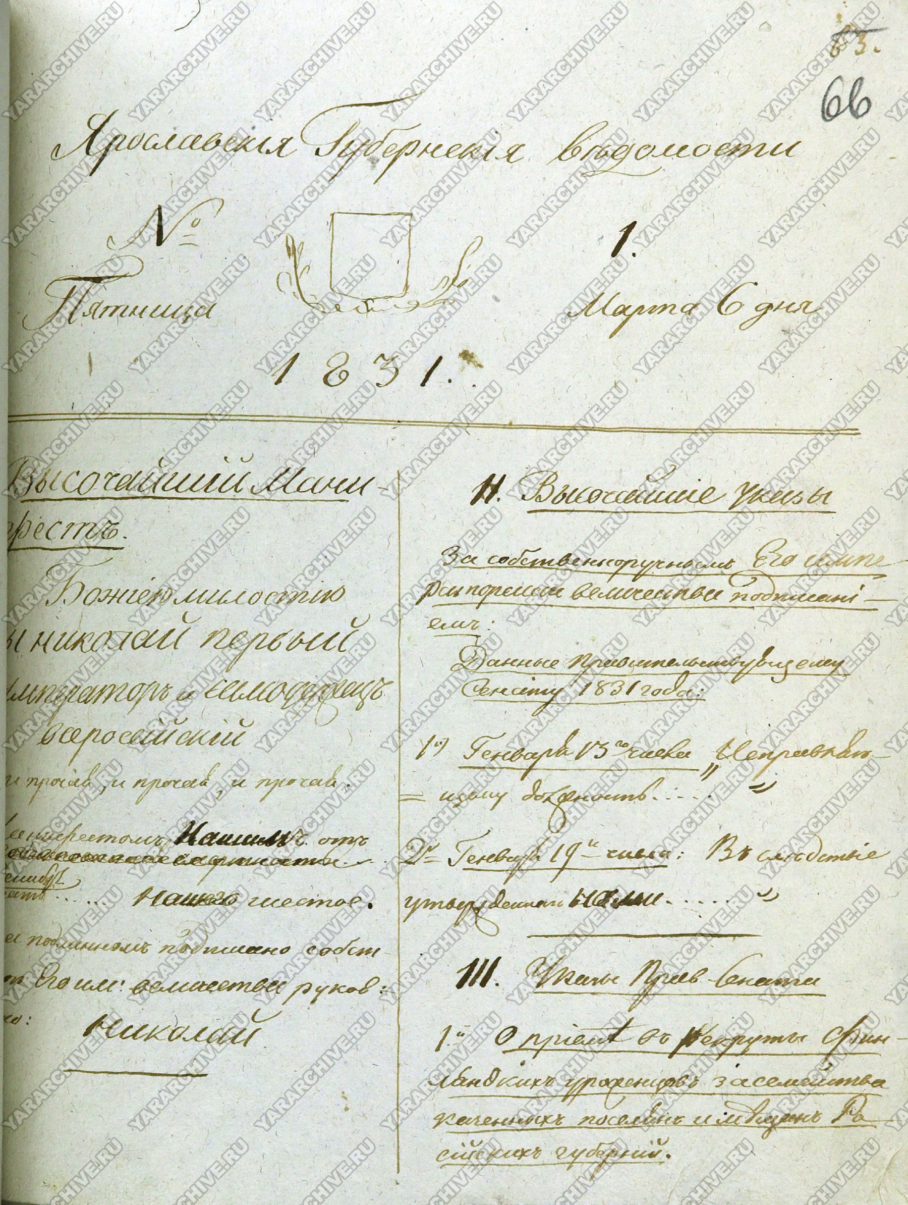 Макет первого номера газеты «Ярославские губернские ведомости». Не позже 6 марта 1831 г. Фрагмент. ГКУ ЯО ГАЯО. Ф. 79. Оп. 5. Д. 167. Л. 66, 66 об, 67.