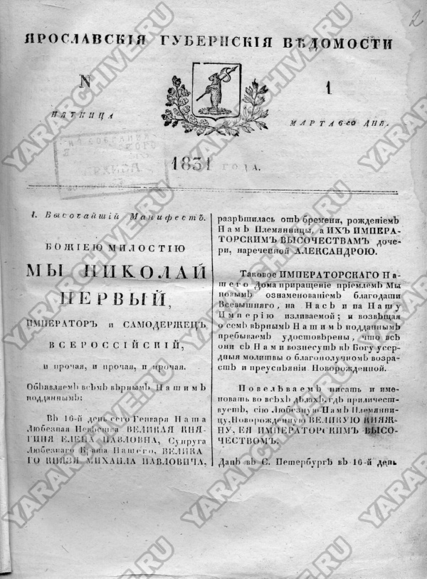 / Главная → Пресс-центр → Публикации → Имена и даты. Год рождения - 1831. К 195-летию со дня выхода первого номера газеты «Ярославские губернские ведомости»