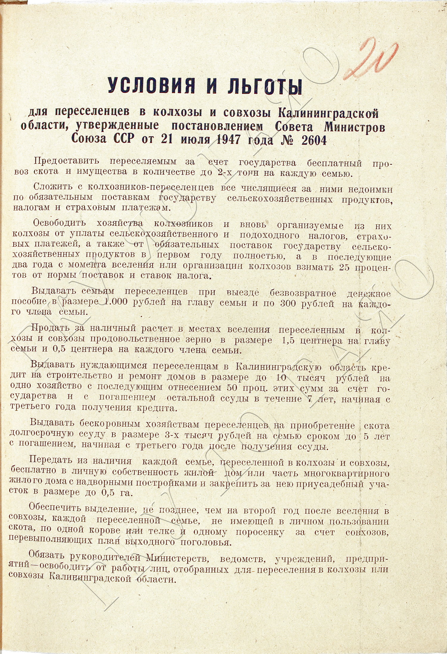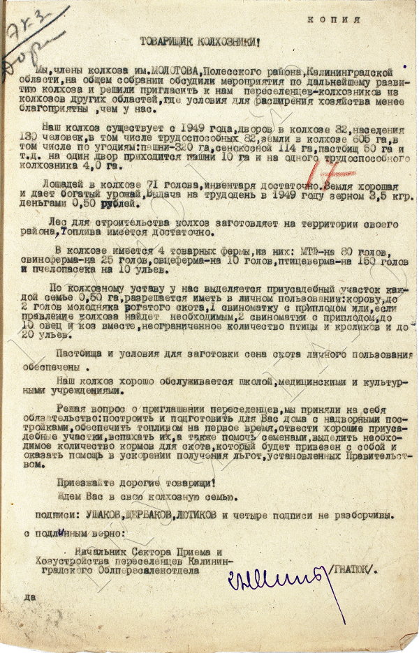 Ответ переселенческого отдела от 24 марта 1949 г. гласил: «На Ваше заявление о переселении в Калининградскую область сообщаем, что, согласно постановлению правительства, переселяются исключительно колхозники, работающие непосредственно в сельском хозяйстве, выработавшие наибольшее количество трудодней и имеющие скот в личном пользовании, поэтому просьбу Вашу о переселении в настоящий момент удовлетворить не имеем возможности17.