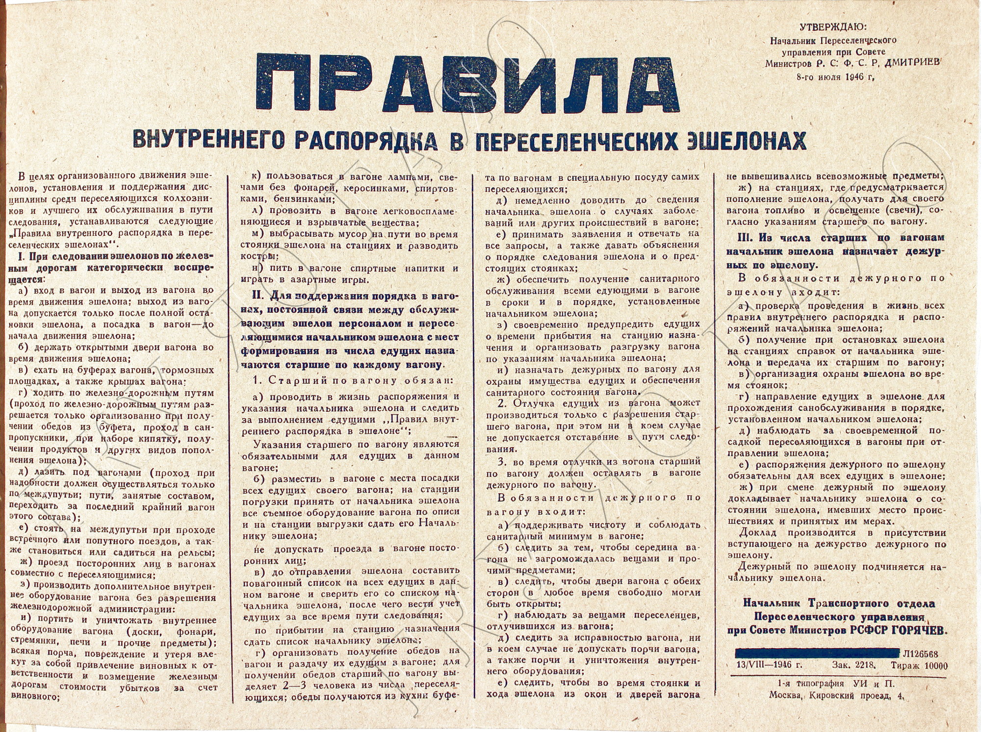 Составить до 1 августа 1946 г. и утвердить план размещения переселяемых колхозников, предусмотрев наделение колхозов необходимыми пахотными, сенокосными, пастбищными и иными угодьями.