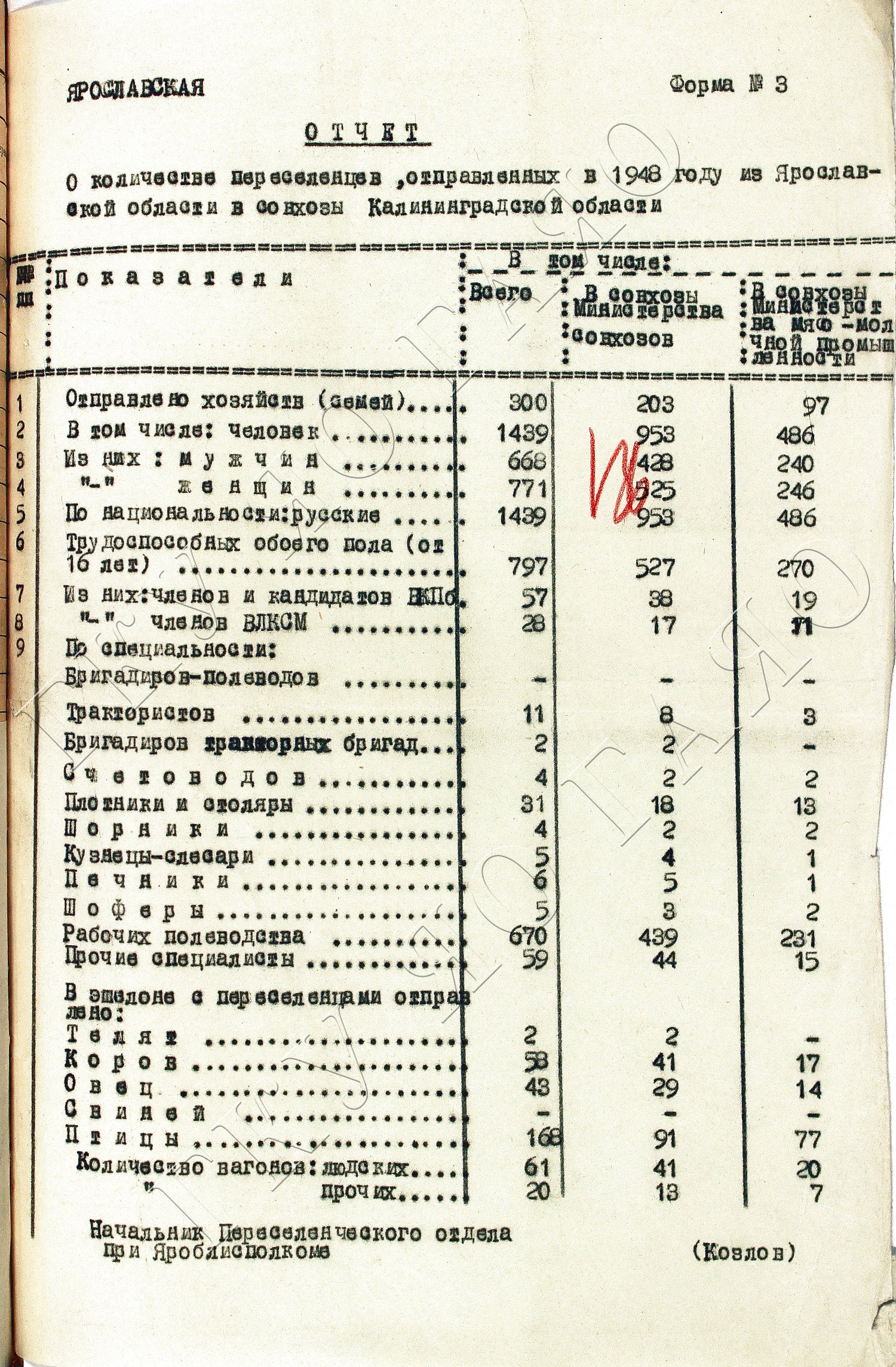 В отчете о проделанной работе переселенческого отдела Ярославского облисполкома по отбору и отправке переселенцев в Калининградскую область от декабря 1948 г. значится: