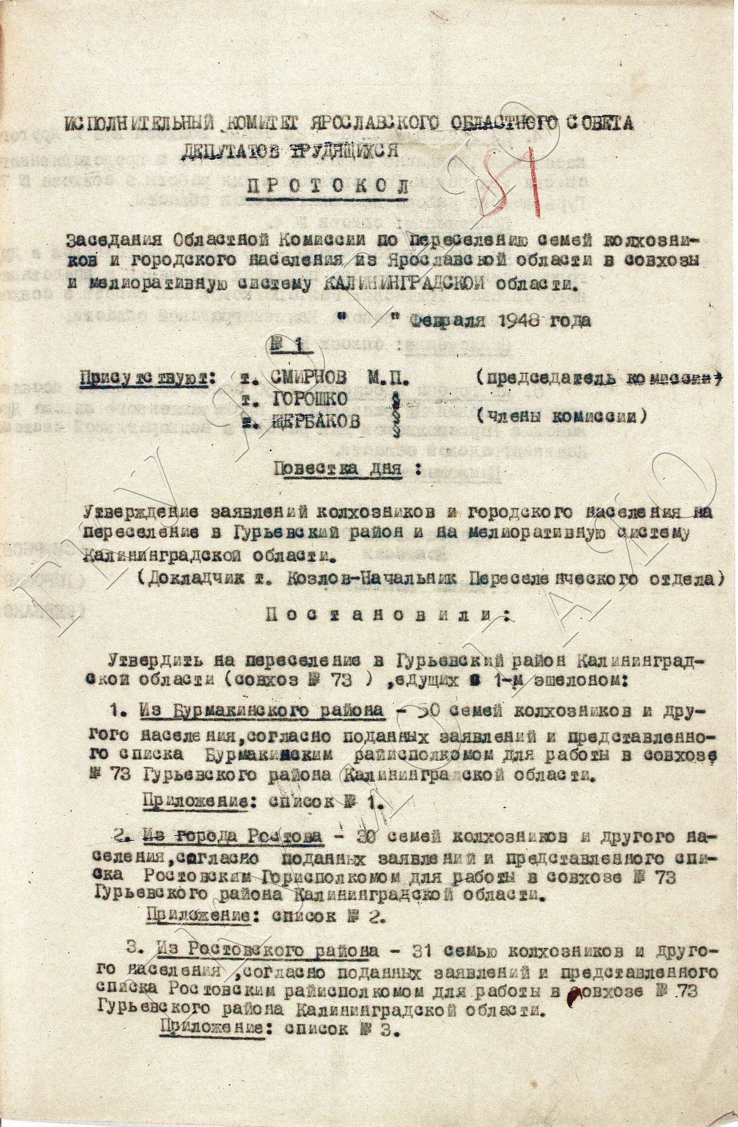 27 декабря 1947 г. Ярославский облисполком принял решение № 2053 «О переселении колхозников и другого населения в колхозы и совхозы Калининградской области», в котором значилось, что в соответствии с постановлением Совета Министров СССР от 21 июля 1947 г. № 2604 установлено переселить в течение