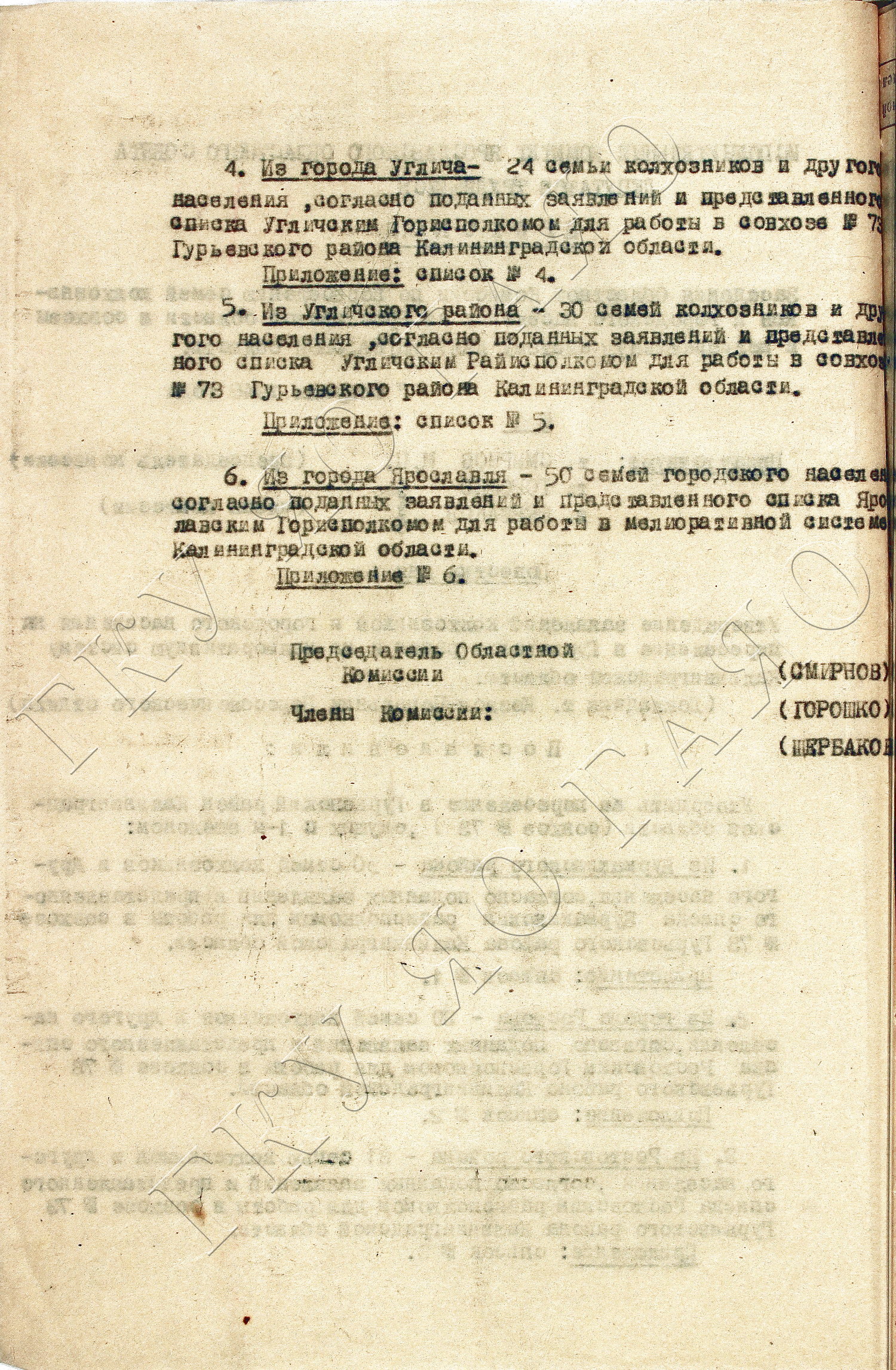 Было постановлено, что из числа колхозников, подавших заявления о переселении, в первую очередь направляются в Калининградскую область семьи демобилизованных из Красной Армии и
