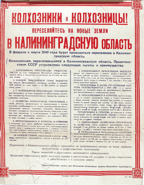 «На Ваше отношение о невозможности отбора 25 колхозных семей на переселение в Калининградскую область исполком облсовета считает Ваше отношение к выполнению важнейшего правительственного задания несерьезным и ничем не обоснованным. Вы не поняли одного: Калининградская область завоевана потом и кровью нашей доблестной Советской армии и что она вновь создается за счет центральных областей нашей Федерации. Не случайно при райисполкомах созданы комиссии для отбора лучших колхозников, которые могут обеспечить и служить примером в создании крепких большевистских колхозов и прочной защитой наших границ. Исполком облсовета обязывает Вас безоговорочно выполнить это важнейшее задание в срок до 20 января 1949 г.»21.