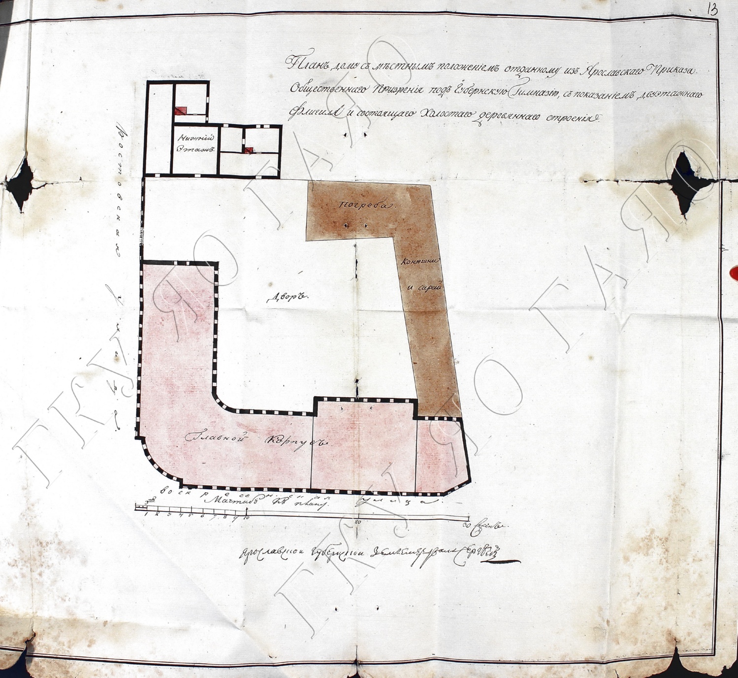 План зданий приказа общественного призрения. 1810 год. Обратите внимание на стену с фальшивыми окнами между главным зданием и флигелем — такой же прием в XVIII веке применялся на домах банковой и почтовой контор для придания эффекта большей внушительности построек (ГАЯО. Ф. 72. Оп. 2. Д. 1967. Л. 13).