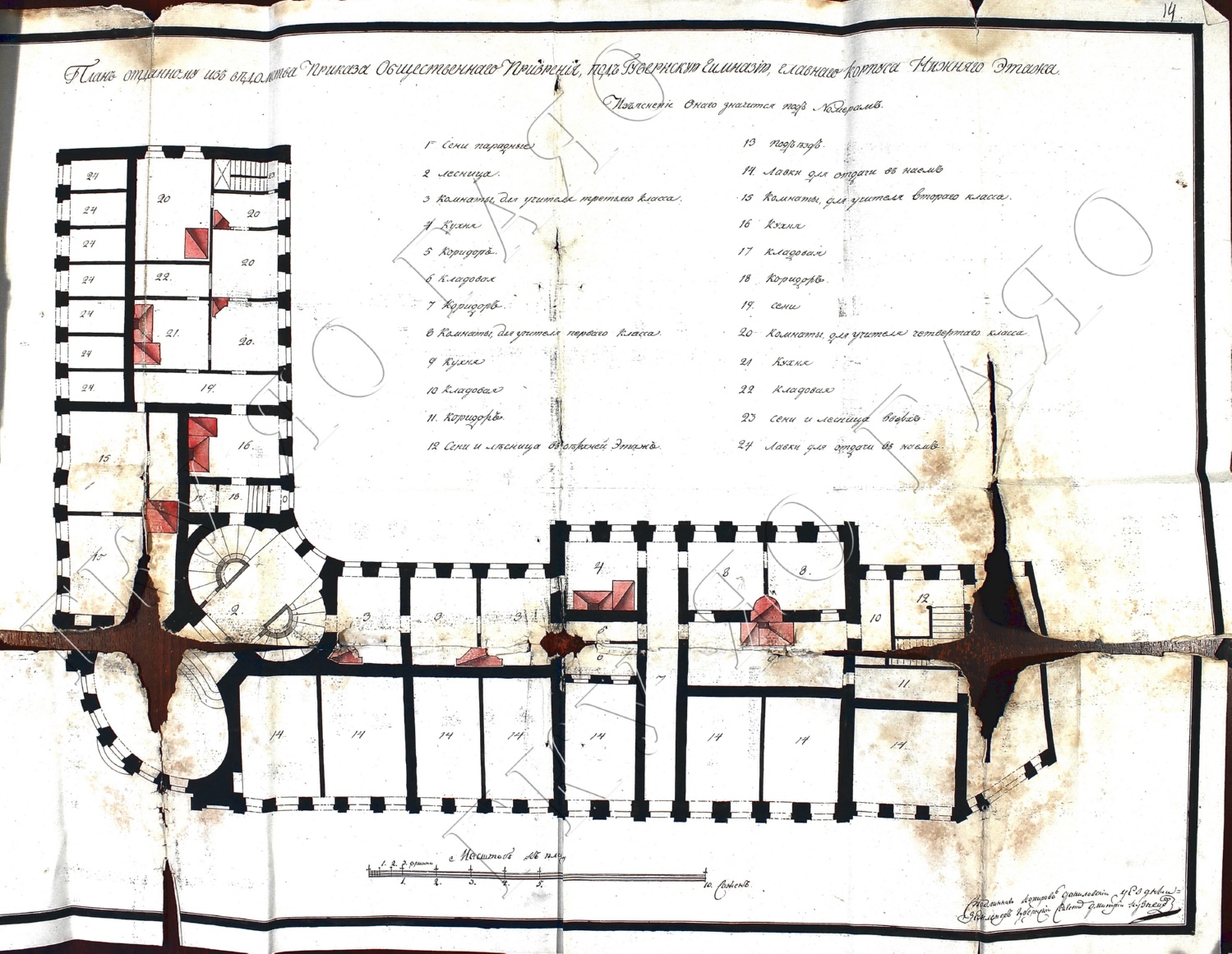 Сначала было приступлено к осмотру старого здания (расположенного возле дома, принадлежащего дворянству), в котором помещалась гимназия. Здание это, занимающее угловое место, каменное, двухэтажное; нижний этаж покрыт частию сводами, некоторые комнаты второго этажа возвышены более прочих и освещены в два света. С 1852 года ничем здание не занято и не ремонтировалось, имеет во многих местах трещины, цоколи до половины толщины стен искрошились; полы, потолки, равно как и стропила, во многих местах обрушились, так что строение необходимо разобрать до подошвы и оценке может подлежать только кирпич, который получится от разломки, и земля в количестве 920 кв[адратных] саж[ен].