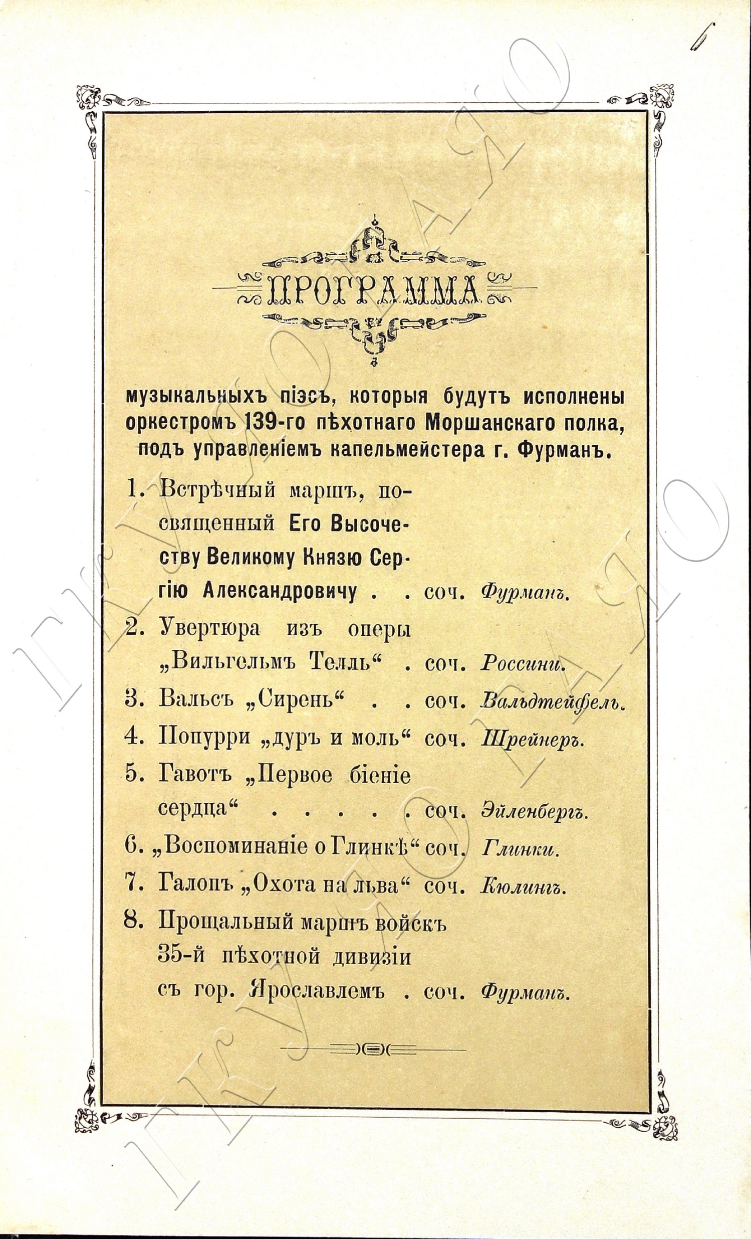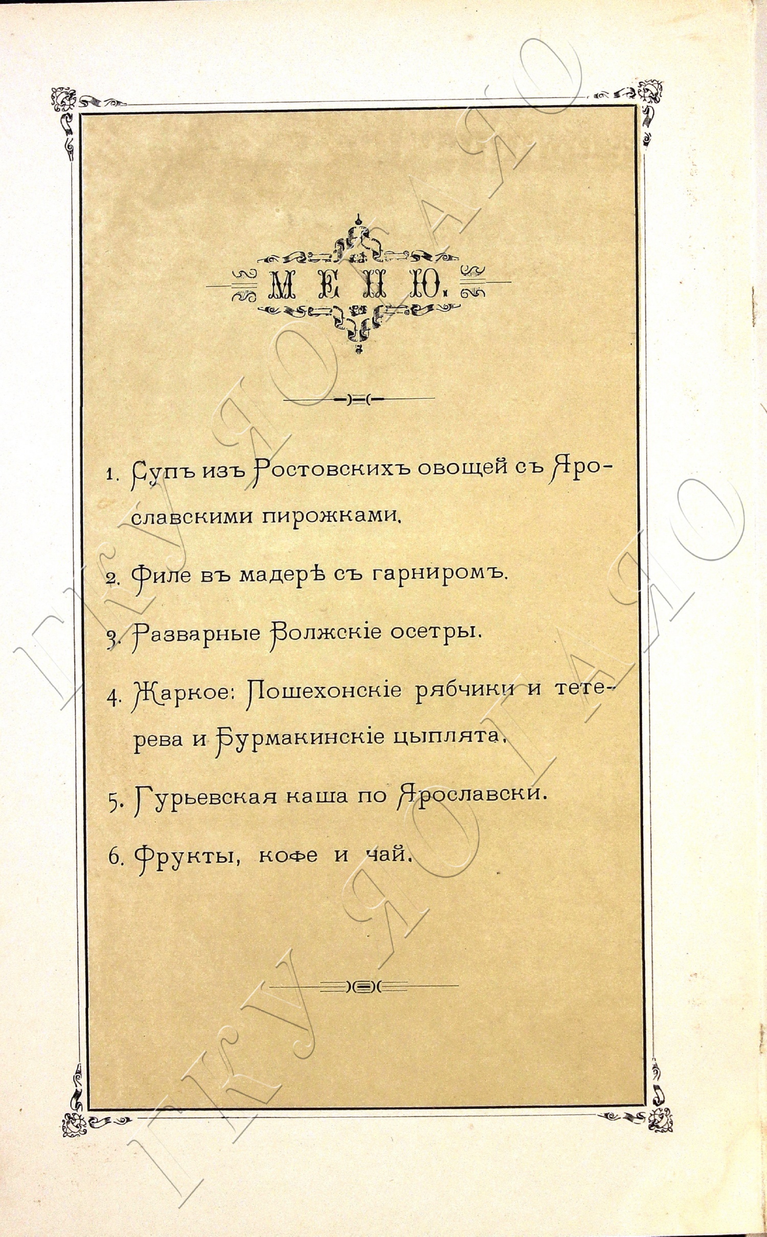 Программа обеда, данного 6 сентября 1892 года в честь отбывающих из Ярославля Нежинского и Моршанского полков (ГАЯО. Ф. 509. Оп. 1. Д. 595. Л.5–6).